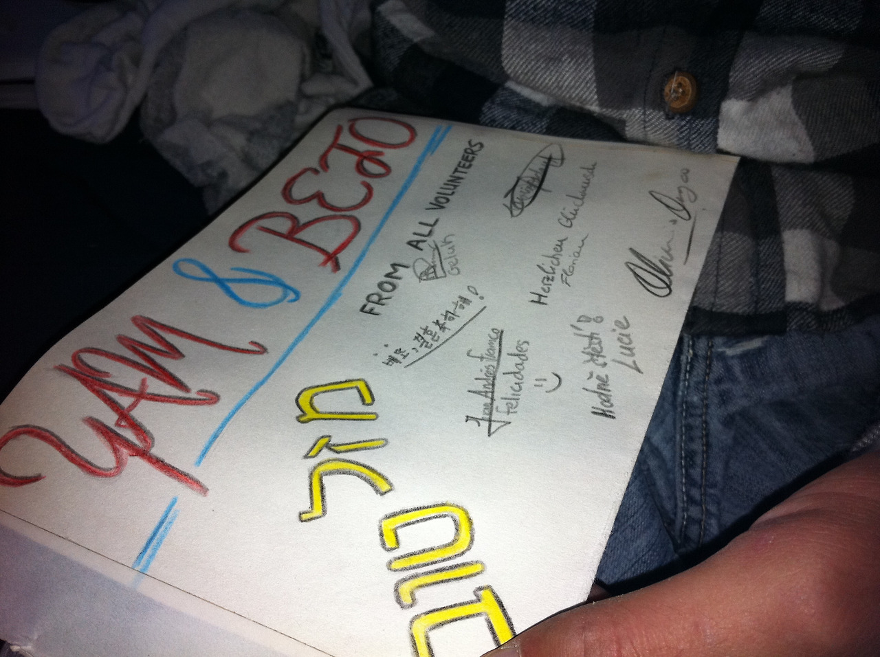 가지런히 세팅된 테이블 중 한자리에 발룬티어들이 모여 앉았다. 평소 발룬티어들과 친근하게 지냈던 베토를 위해 우리는 조금씩 돈을 모아 축의금을 마련했고, 각국의 언어로 축하한다는 메시지를 적은 봉투에 돈을 담아 신랑에게 전달했다.