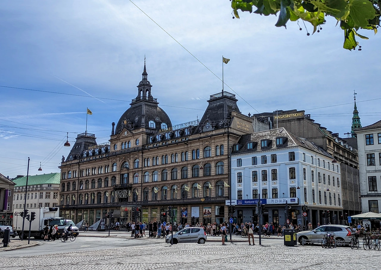 타워를 내려와 또 길을 걷고 걸었다. 이왕 나온 김에 뉘하운까지 걸어가보고 싶어 구글맵에 Nyhavn 운하 보트 선착장을 찍고 발걸음을 뗐다. 위쪽 사진에 보이는 길은 명품 거리로 길을 건너면 다양한 명품 브랜드 상점들의 화려한 쇼윈도를 구경할 수 있다. 이 길을 따라 쭉 가면 골목길 오른쪽으로 코펜하겐에서 가장 오래된 백화점인 마가신(Magasin) 백화점과 그 옆으로 콩겐스 뉘토르브 광장(King's New Square)이 위치하고 있다.