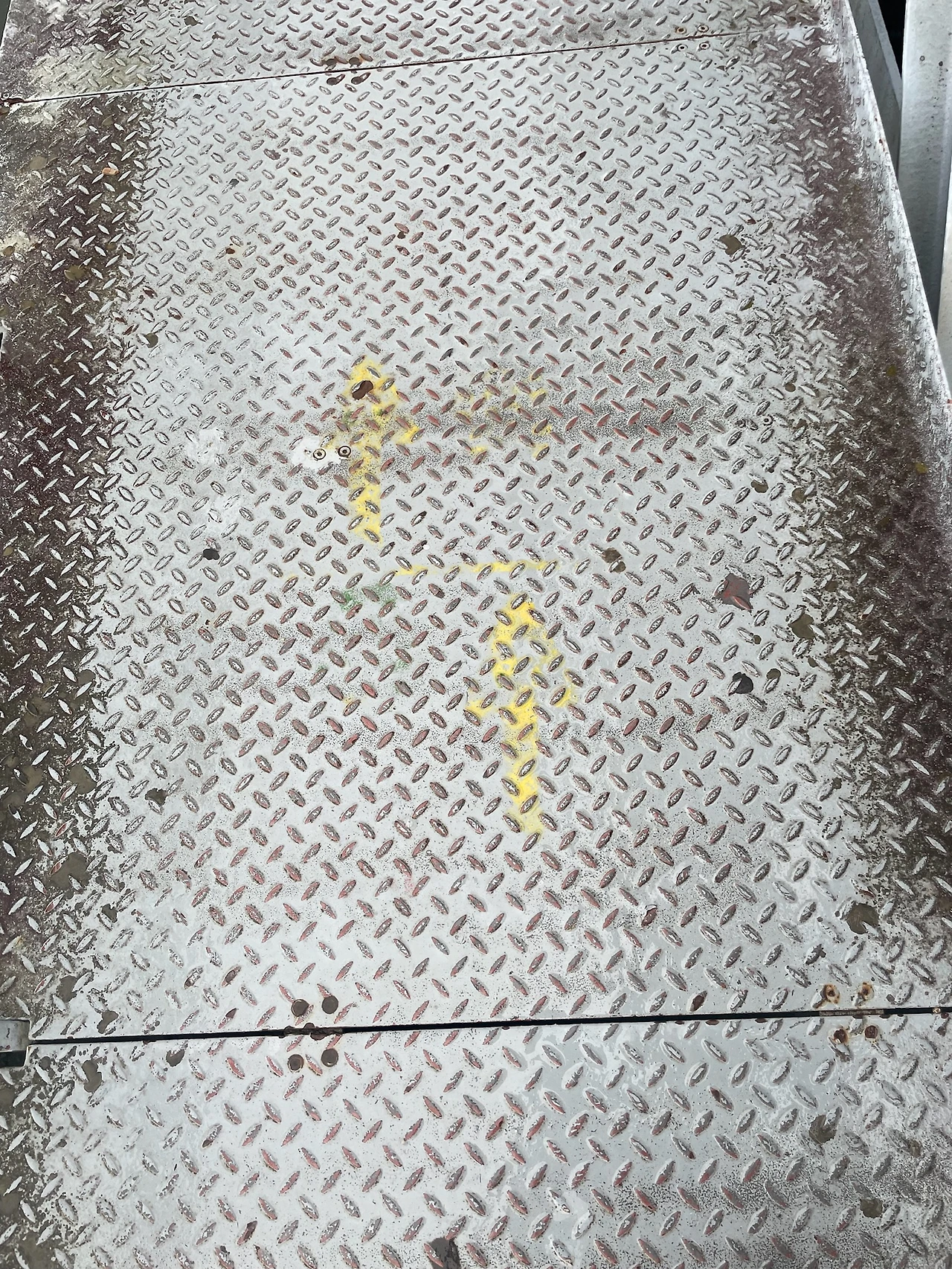 나오는 한 건물 벽면에 걸린 커다란 노란 화살표가