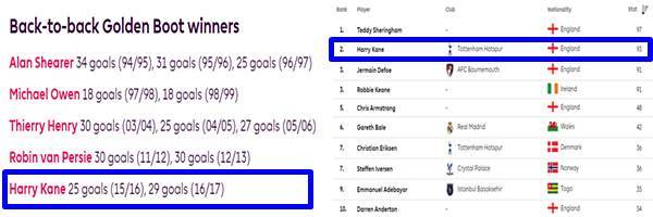 케인에게 있어 올 시즌 EPL의 '골든 부트'는 그 어느 때보다도 탐이 나는 물건일 터. 지난 2015-2016 시즌 25골을 넣어 생애 첫 EPL 득점왕에 오른 케인은 2016-2017 시즌 29골로 2년 연속 득점왕을 차지했다. 만약 케인이 올 시즌에도 득점왕에 오른다면 시어러, 티에리 앙리에 이어 역대 세 번째로 '세 시즌 연속 득점왕'에 등극하는 선수가 된다.