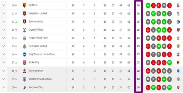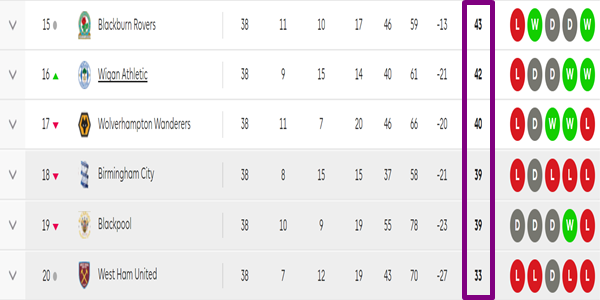 20개 구단 체제로 개편된 1995-1996 시즌부터 2016-2017 시즌까지 18위로 강등된 팀의 평균 승점은 36.8점이었다. 통상 승점 40점을 확보하면 1부리그 잔류 안정권으로 분류되지만, 방심은 금물. 2002-2003 시즌 웨스트햄 유나이티드는 승점 42점을 쌓았지만, 최종순위 18위로 강등의 아픔을 맛봐야 했다. 이외에도 1996-1997 시즌 선덜랜드, 1997-1998 시즌 볼턴 원더러스가 승점 40점을 얻고도 강등을 당했다.