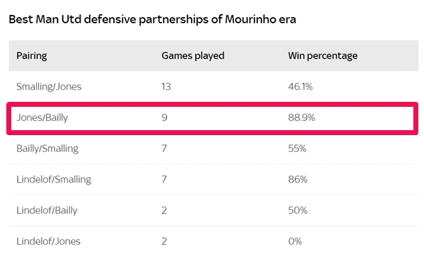 영국 스카이스포츠의 통계에 따르면 무리뉴 감독 체제에서 맨유의 중앙 수비수들 중 최고의 ‘케미’를 자랑하고 있는 커플은 바이와 필 존스다. 바이와 존스가 합을 맞춘 리그 9경기에서 맨유는 8승을 거두며 승률 88.9%를 자랑했다. 바이와 존스가 각각 부상을 당해 꾸준히 호흡을 맞추지 못했던 게 맨유 팬들의 입장에서는 못내 아쉬웠을 터. 반면 가장 자주 호흡을 맞춘 조합은 크리스 스몰링과 존스인데, 스몰링-존스 조합은 13경기 승률이 46.1%에 불과해 최선의 중앙 수비 조합으로 평가하기엔 무리가 있다. 올 시즌 들어 두 차례 선발로 나선 바이-린델로프 조합은 2경기에서 1승을 거둬 승률 50%를 기록 중이다.