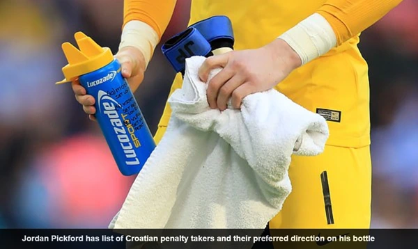 19일(이하 한국시간) 영국 일간지 데일리메일은 픽포드 골키퍼의 손에 들린 물병을 클로즈업했다. 푸른색 물병에는 픽포드가 직접 쓴 메모가 빼곡했다. 데일리메일에 따르면 해당 메모에는 크로아티아의 페널티킥 예상 키커들과 그들이 선호하는 슈팅 방향이 기록되어 있었다. 아쉽게도(?) 픽포드는 페널티킥 상황이 없어 메모의 내용을 실천으로 옮길 순 없었다.