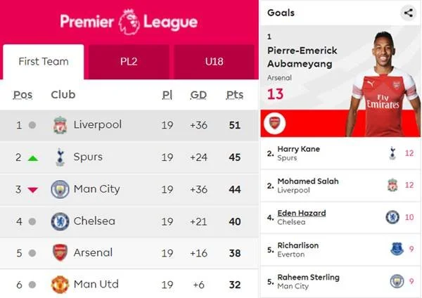득점 부문 단독 선두는 지난 1월 아스널의 유니폼을 입은 오바메양이다. 오바메양은 박싱데이에 펼쳐진 브라이튼 앤 호브 알비온과의 19라운드 경기서 전반 7분 만에 환상적인 오른발 감아차기로 골망을 갈라 리그 13호골을 신고했다.