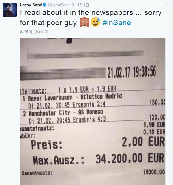 그는 자신의 소셜미디어를 통해 “르로이 사네는 나에게 3만4천200 유로의 빚을 졌다”며 진한 아쉬움을 드러냈다.