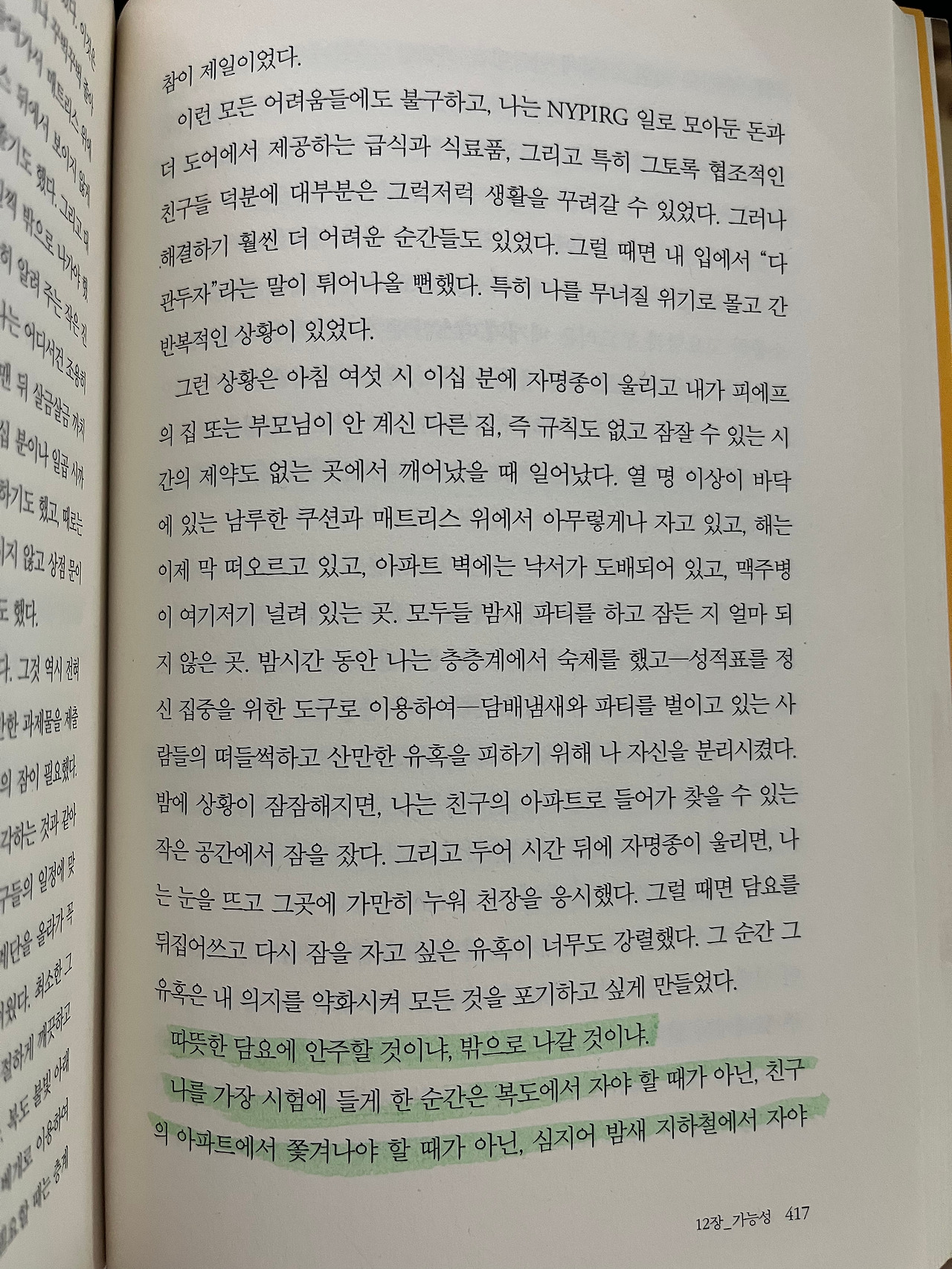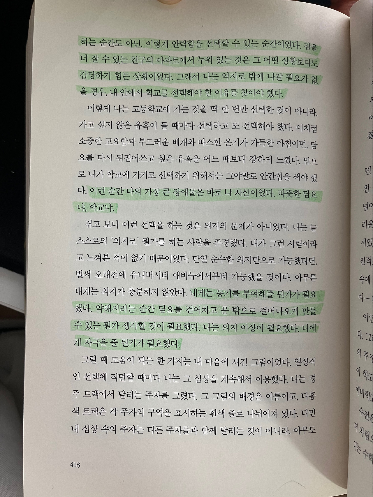 그 유혹은 너무나 달콤해서, 모든 걸 포기하게 만들 만큼 강력했다. 그래서 리즈 머리는 고백한다. “나는 고등학교에 가는 것을 한 번 선택한 게 아니라, 매일 아침 담요를 걷어차고 또 다시 선택하고 또 다시 선택해야 했다.” 그리고 그렇게 말한다. “나에게는 의지가 충분하지 않았다. 나에겐 담요를 걷어차게 만들 무언가가 필요했다.” 그 문장은 5년이 지난 지금까지도 내 안에 살아있었는데, 나만의 따뜻한 담요를 걷어차는 것이 어려울 때마다 위로가 됐다.