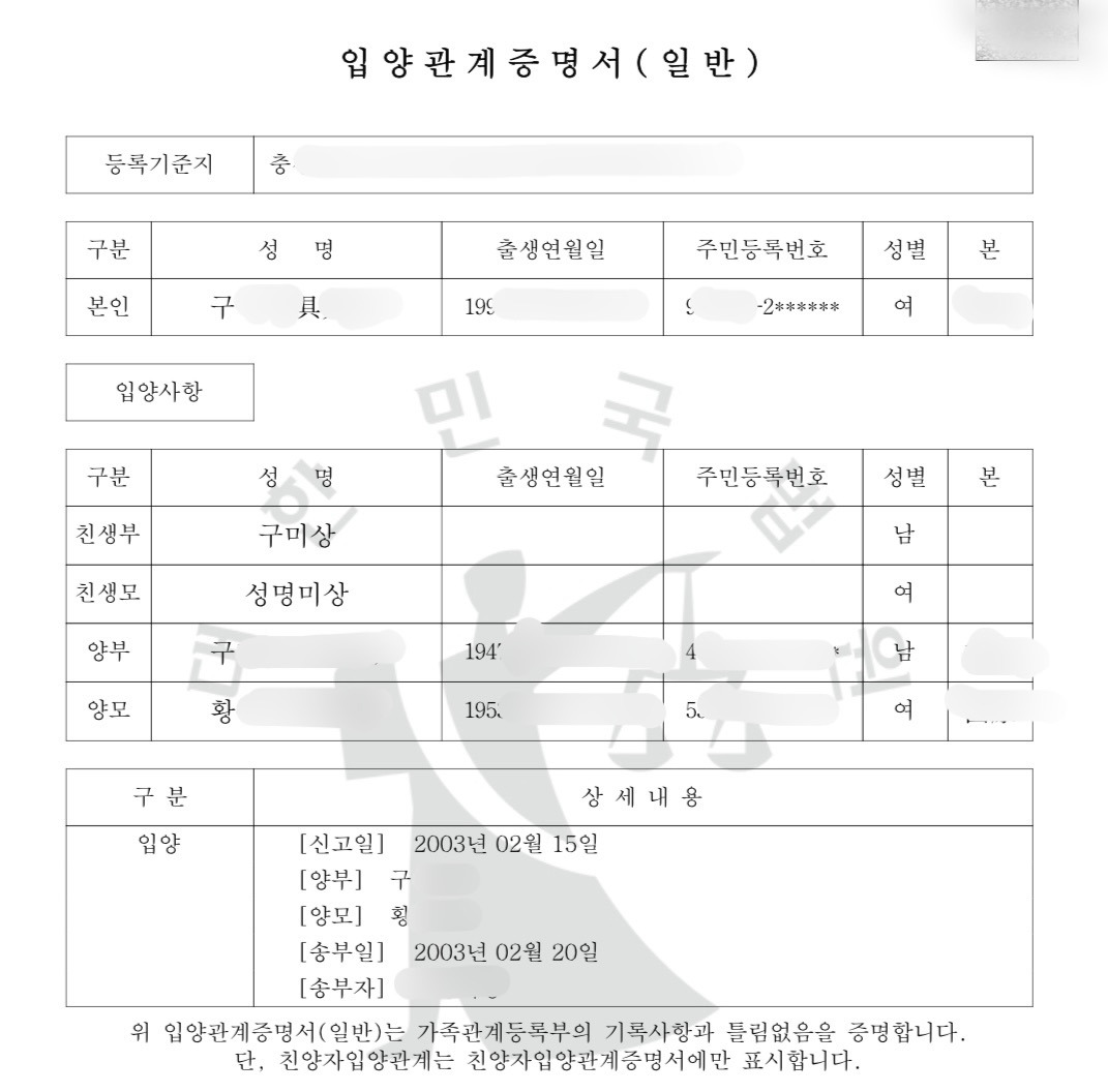 지금은 모르겠습니다만, 1996년 제가 4살이던 해에는 입양을 위해선 경제적 여유가 있는 것을 증명해야 했습니다. 하지만 저희 집은 단 1개월도 저축하지 못하는 형편이었지요. 아버지 혼자 벌어 다섯 식구를 먹여 살리셨거든요.