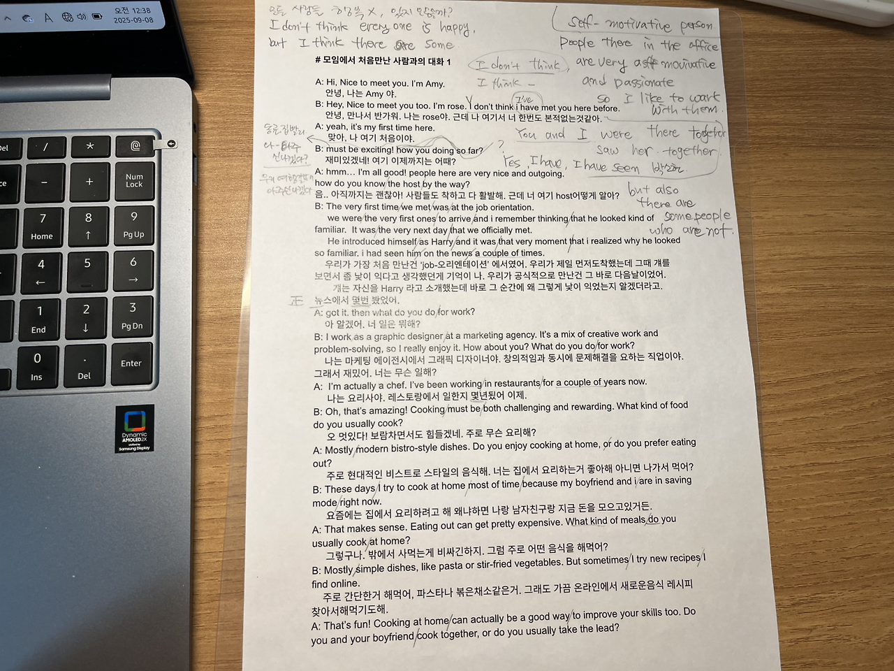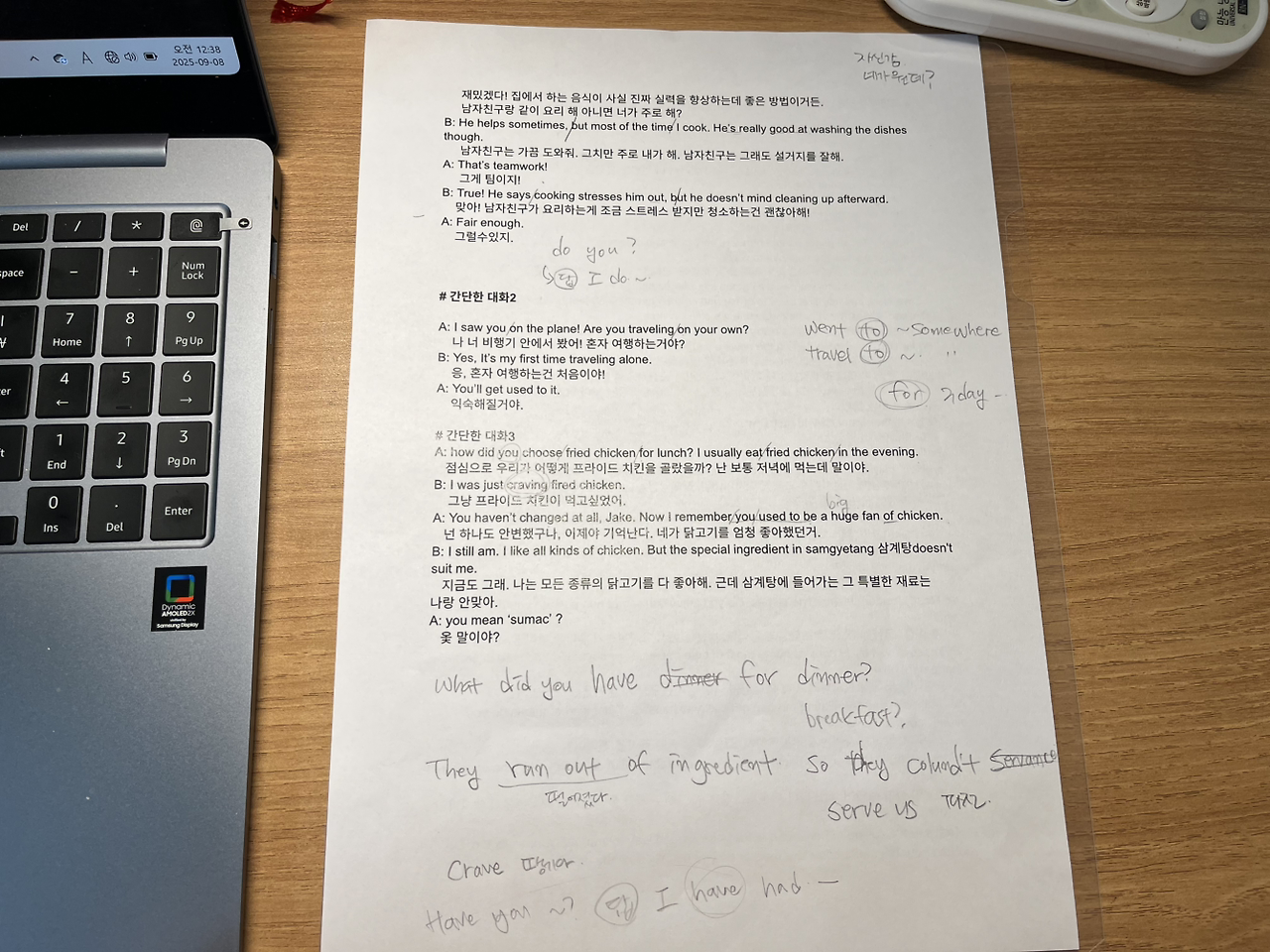 나도 간절한 만큼, 지나간 시간에 대한 미련을 지우기 위해 노력했다. 첫 수업이 있기까지 열과성을 다하여 과제로 내준 대본을 달달 외웠다. 회사 일을 마치고 밤 11-12시에 집에 들어와도 책상 앞에 앉아 영어 문장을 달달 외웠다. 소리를 내어 반복하고, 문장의 구조를 입에 익히며 점점 머릿속이 낯선 언어의 리듬으로 가득 차는 게 느껴졌다. 피곤보다 먼저 찾아오는 건 오히려 묘한 두근거림이었다. 드디어 첫 수업이 시작되었는데 수업 1시간이 10분밖에 흐르지 않은 듯했다.