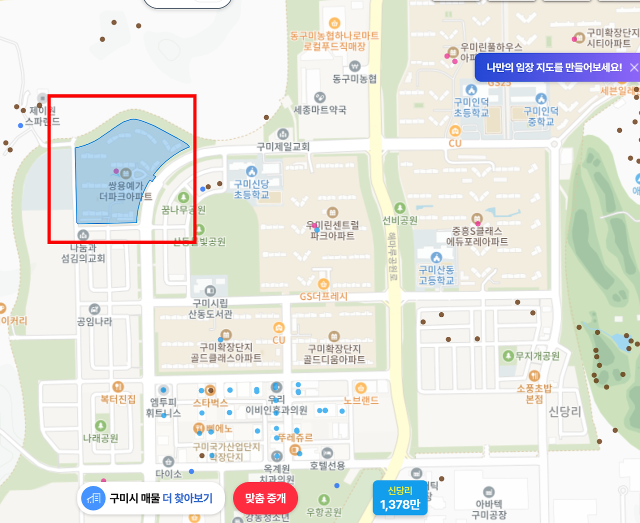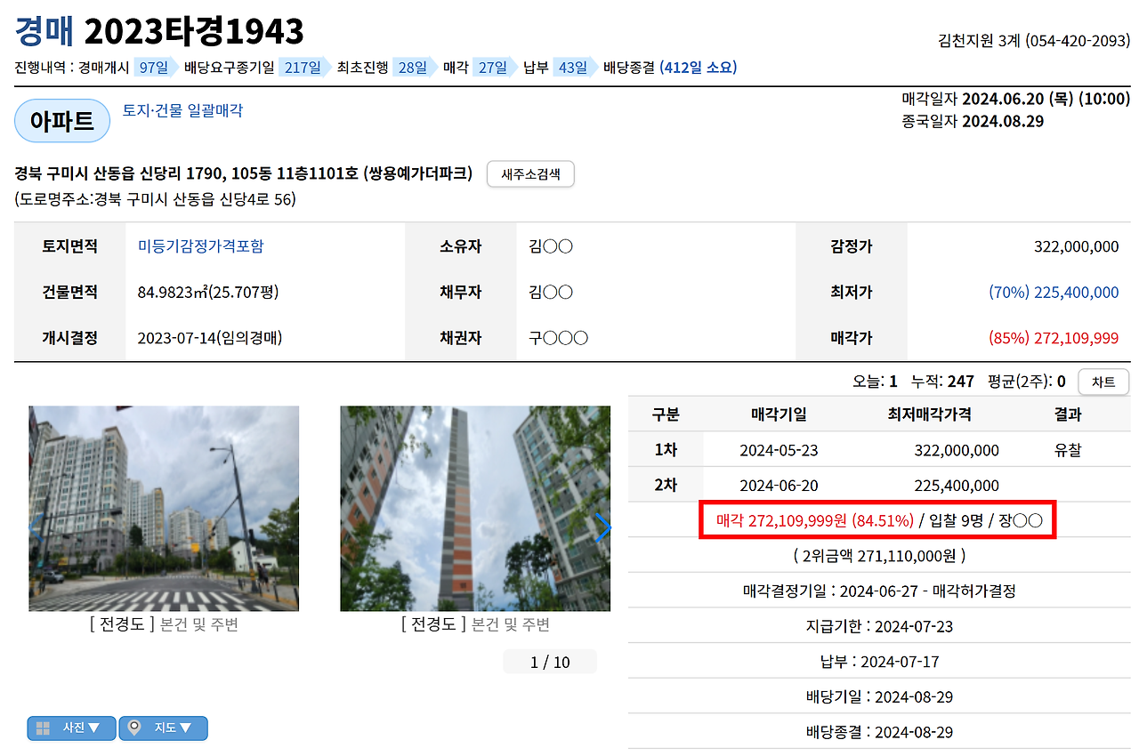 그동안 많은 부동산 투자 물건을 찾고 또 찾았다. 돈이 없어도 말이다. 그리고 이미 낙찰되고 매도된 사례를 공부했다. 그중 예전에 경매 낙찰 매도 사례로 공부했던 구미 쌍용예가더파크 아파트가 있었다.