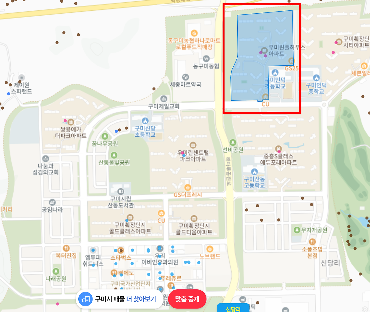 구미 지역은 몰랐지만 위의 지도를 보고 왠지 익숙한 것이, 예전에 공부했던 기억이 떠올라 나를 들뜨게 했다. 단기 매도로도 좋고 임대수요가 좋은 입지라는 것을 바로 알았으니까.