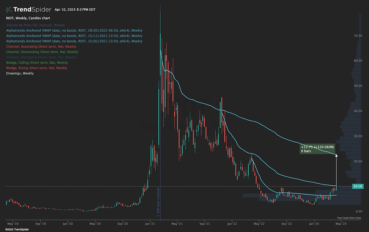 RIOT은 다시 중요한 AVWAP 저항선에 다가섰다. 만일 현재 저항 구간을 극복한다면 다음 목표가는 최고점(all time high)을 시작점으로 그린 AVWAP과 만나는 $23이다. 이는 4월 10일 종가 기준으로 120% 상승이다. 최고점 이후의 가격별 볼륨 (volume by price)를 보면 $11과 $23 사이의 거래량이 눈에 띄게 적은 것을 볼 수 있다. 이 가격 구간에서는 손바뀜이 적었기 때문에 잠재적 매도세력(overhanging supply)도 적을 것이라고 기대할 수 있다. 따라서 $11 저항선이 일단 뚫리면 $23까지 가격 상승은 신속하게 이루어질 가능성이 높다.