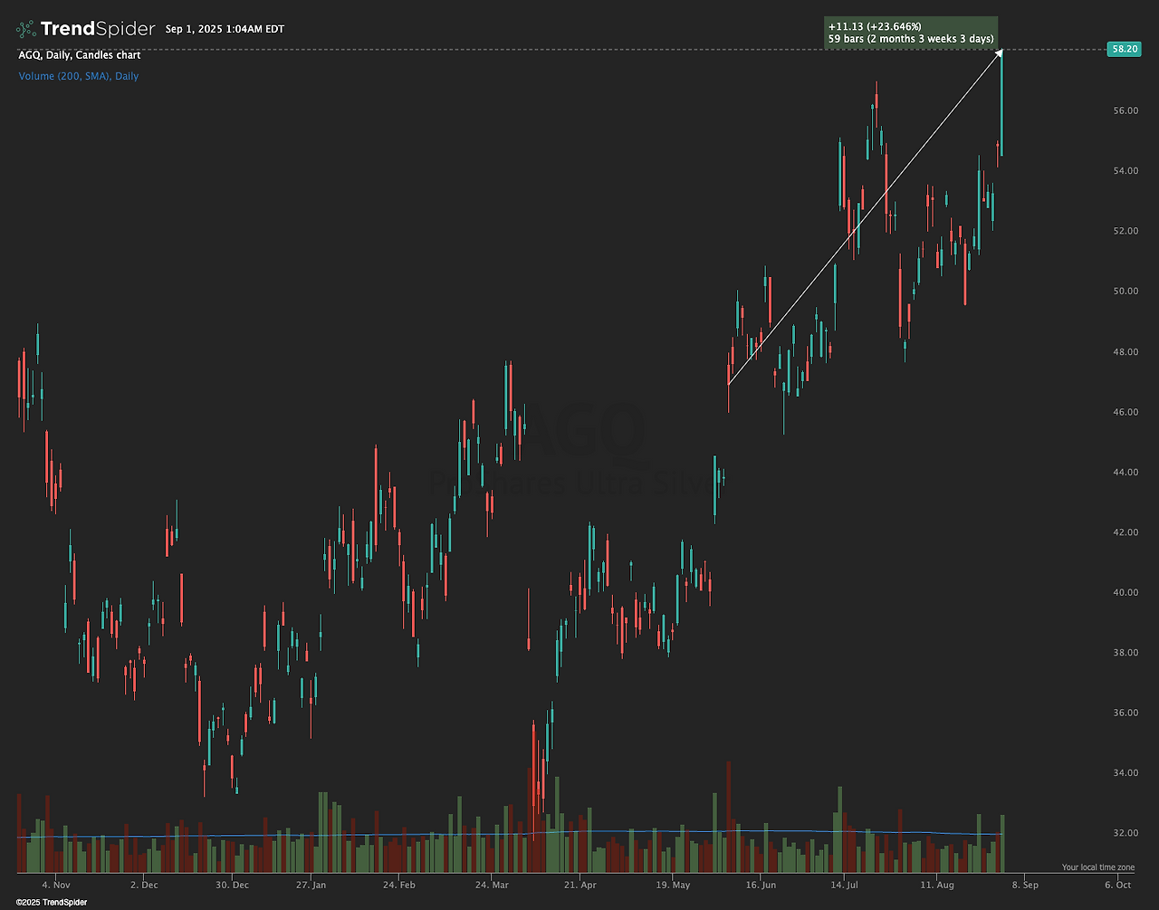최근 은의 상승세가 심상치 않다. 앞서 올린 Silver Breakout 포스트에서도 언급했듯이, 나의 핵심 투자 포지션은 금과 은이다. 금 광산 주식인 CDE와 NUGT는 6월 5일 포스트 이후 각각 39%, 36% 상승했다. 은 레버리지 ETF인 AGQ는 23% 상승에 그쳤지만, 이제는 은이 본격적으로 움직일 시기가 온 것 같다.