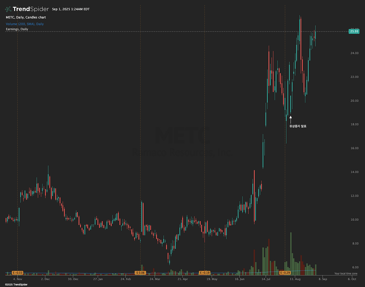METC는 8월 5일, $200M 규모의 유상증자를 발표하면서 단기적인 주가 조정을 겪었지만, 이후 빠르게 회복하며 시장의 높은 관심을 입증했다. 트럼프 행정부가 보호주의 기조를 유지하고 미국 내 핵심 광물 자립을 가속화한다면, METC는 이 희토류 테마의 핵심 수혜주로 자리 잡을 가능성이 크다.