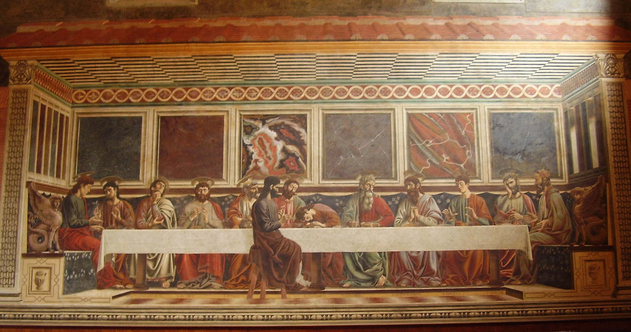 초기 르네상스 시대에 활동했던 안드레아 델 카스타뇨 Andrea del. Castagno 가 그린 <최후의 만찬>이다. 인물들 뒤에 있는 벽화에서 그림 자체가 뿜는 화려함과 다채로움이 느껴진다. 진면목은 압도적인 균형미에 있다. 일정한 폭을 가진 6개의 벽화 그리고 벽화 변연에 일렬로 배치된 예수와 12제자의 얼굴, 천정과 평행하게 배치된 식탁은 균형미의 정석을 보여주는 듯 하다. 식탁의 길이 조차도 양쪽 끝에 위치한 벽화의 1/2까지만 설정되어있다. 화려함이 버무려진 안정감은 다른 <최후의 만찬>에서는 풍기지 않았던 느낌이다.