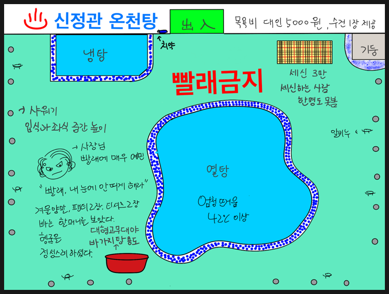 사우나실이 없어서 비좁은 냉탕은 동네 사랑방이 되었다.