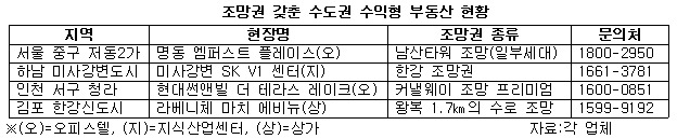 이런 가운데 서울 도심 한강변, 남산, 서울 인근 하남 미사 강변도시와 물의 도시 청라국제도시, 김포 한강신도시 등에 공급되는 상가나 오피스텔, 지식산업센터가 우수한 조망권으로 주목받고 있다.