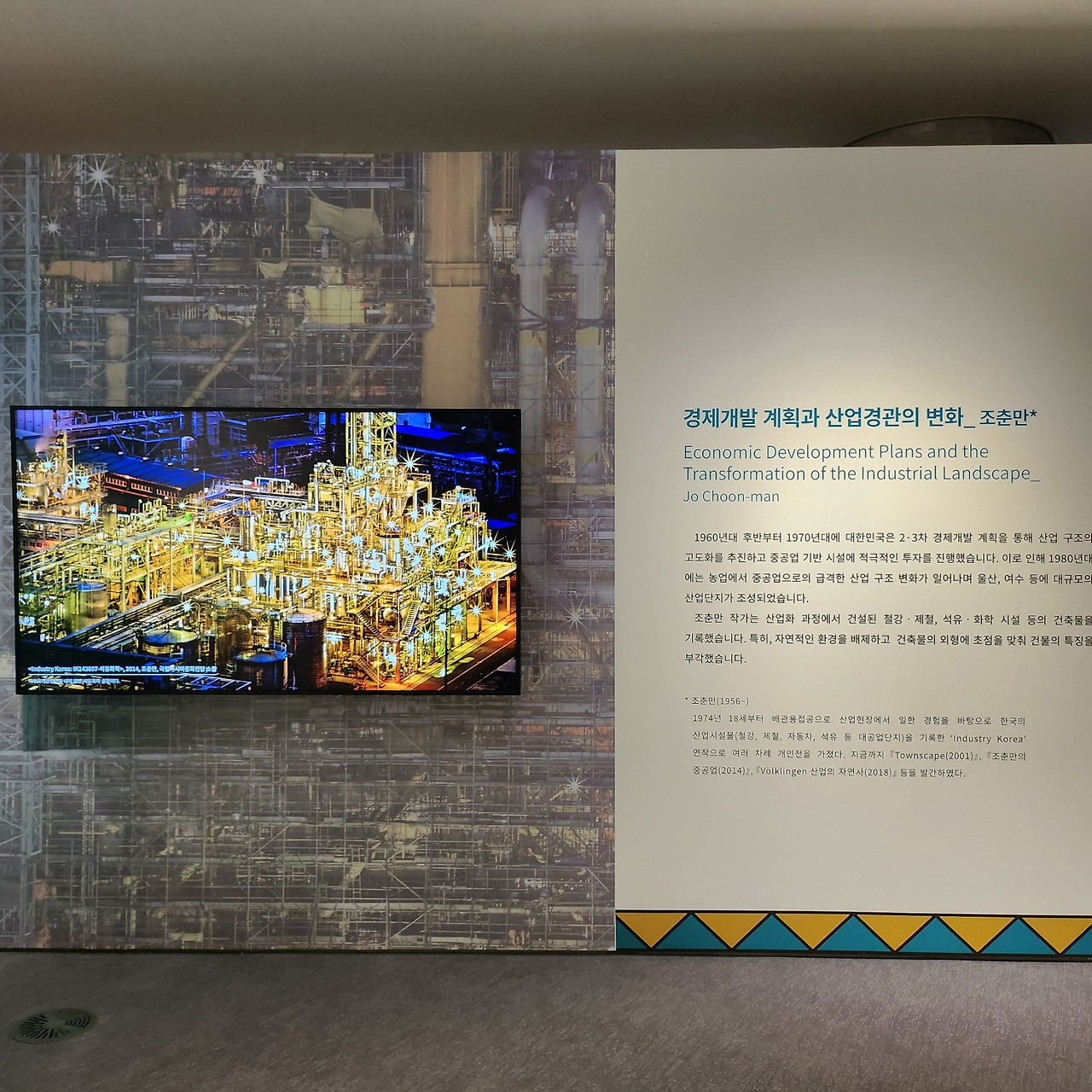 전시장에 놓인 <조춘만 중공업> 사진집 표지가 눈에 들어왔다. 하얀색 안전모와 작업복 차림의 남자가 서 있다. 사진 속 주인공은 조춘만 작가이다. 그는 ”기계는 생명을 갖고 있다. 촬영에 몰입하면 기계가 살아 움직이는 소리를 들으면서 대화를 한다는 느낌도 든다 “고 말한다. 산업미를 기록한 사진가인 동시에 실제로 산업현장의 일원이기도 했다.