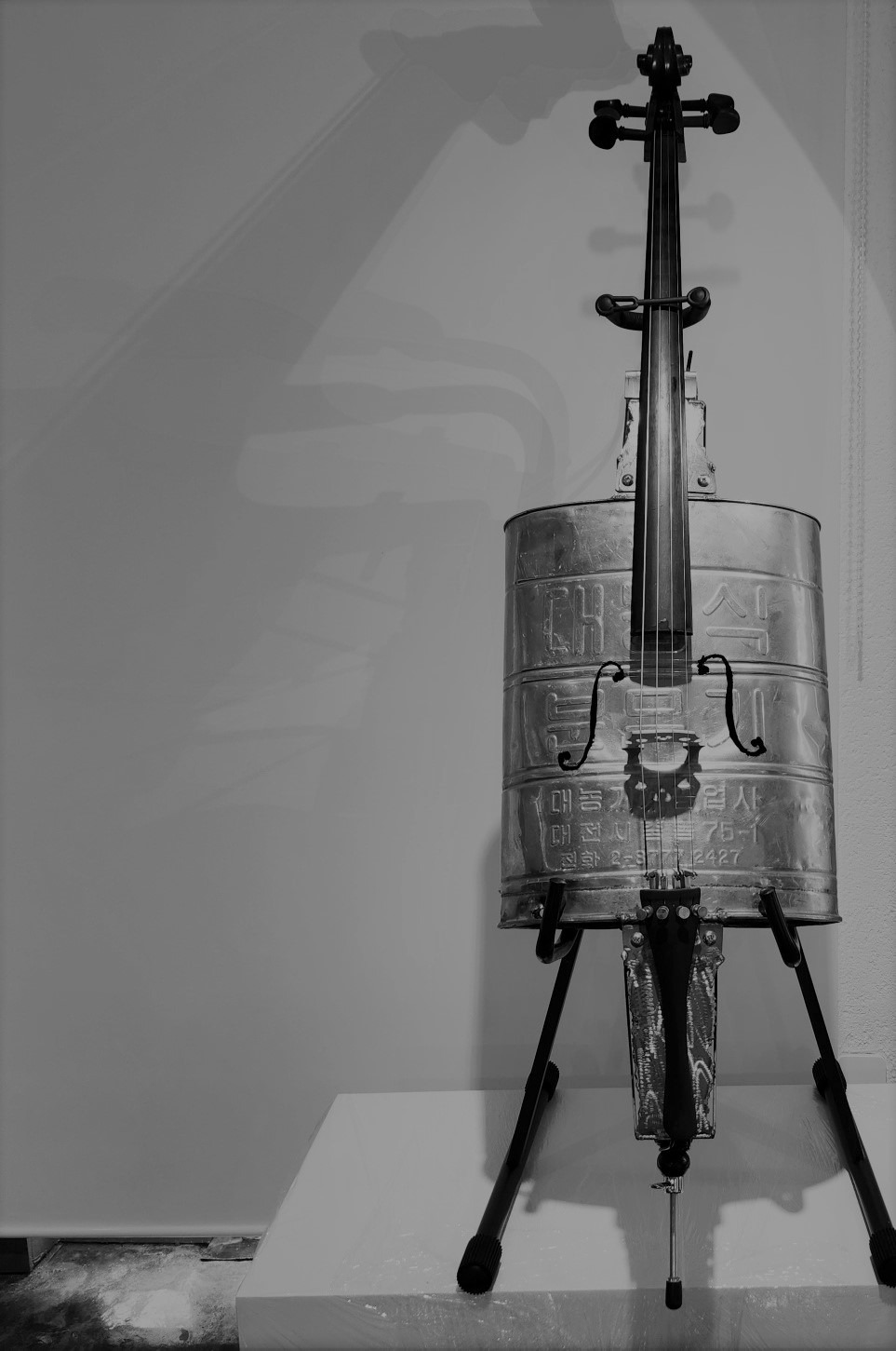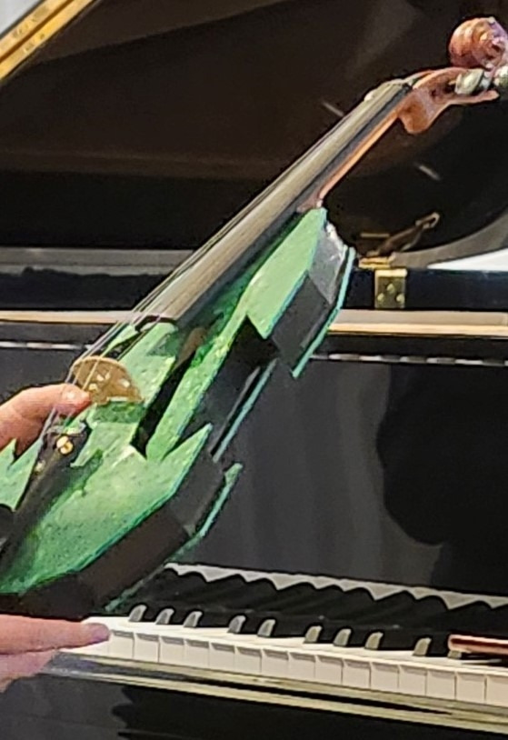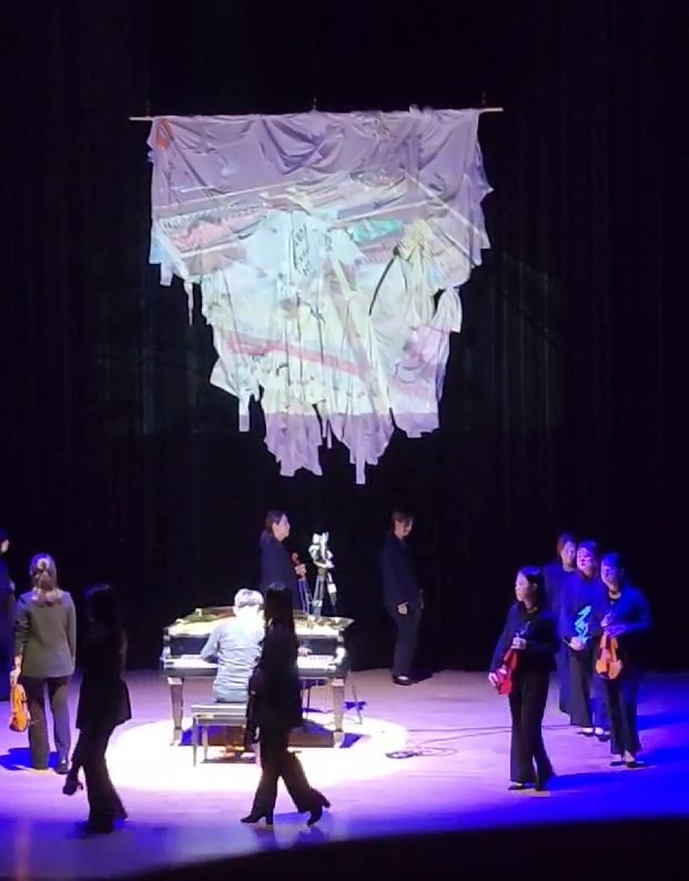 유니크 첼로, 버려진 농약분무기와 연습용 첼로를 결합해 만들었다. 레고 플라스틱으로 만든 16대의 다양한 색깔의 바이올린(그럼에도 불구하고 음색이 부드럽고 자연스럽다) 그리고 연주의 피날레에서 피아노와 함께한 50벌의 헌 옷천을 이어 붙여 오브제화한 주홍작가의 작품, 무대 위 어둠 속 허공에서 내려와 올려다보았다. 죽은 영혼을 암시한 걸까?