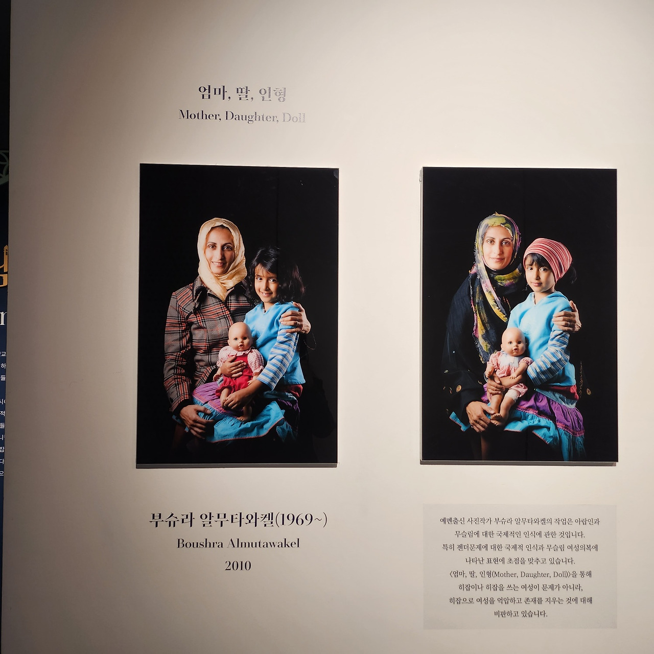 지난번 ACC아시아문화박물관 기획전시 <살람, 히잡 Salam, Hijab> (3월 17일까지) 전시장 입구에서 만났던 부슈라 알무타와켈(Boushra Almutakel)의 <엄마, 딸, 인형> 사진 작업, 히잡의 착용으로 엄마, 딸, 인형의 모습이 점점 지워지는 연작을 보며