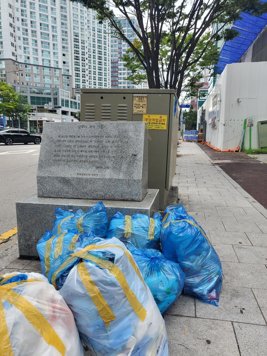 상무대 표석 이전 관련 내용이 적힌 화강암 표석(1997년 제작) 옆에는 쓰레기가 담긴 종량제 봉투만이 가득하다. “이렇게 방치를 해도 되는가?”