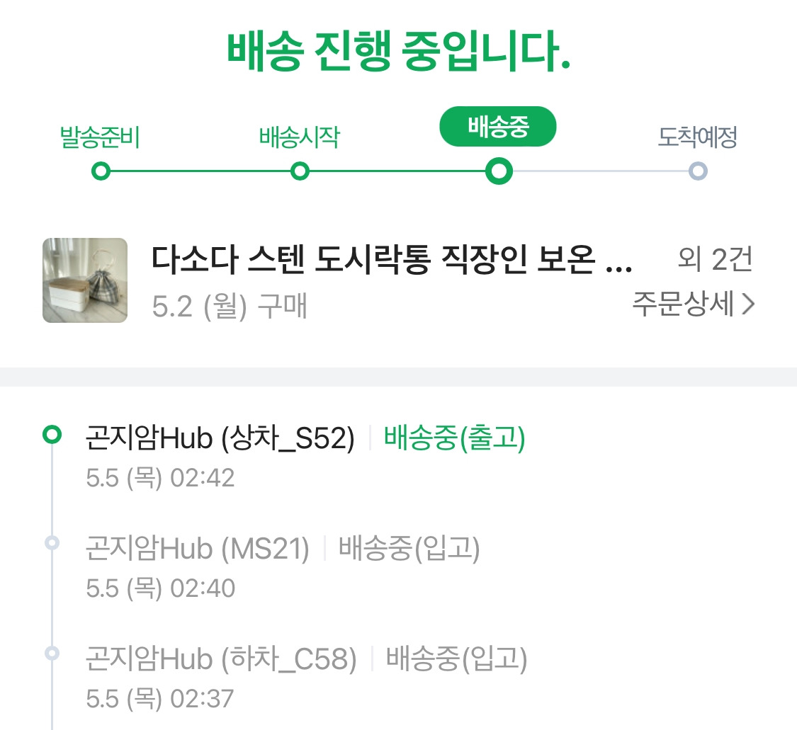 그러나 미처 생각하지 못한 게 있으니 목요일이 어린이날인 것과 도시락통 판매 업체가 화요일에 물건을 보내지 않을 수도 있단 사실이었다. 하필이면 화요일이 너무 바빠서 도시락 통이 발송되었는지 아닌지 확인도 못한 채 하루를 보냈고, 수요일이 돼서야 확인을 하니 택배가 곤지암 허브에 묶여 있다는 표시가 보였다. 아, 이걸 어쩌지. 어린이날, 어버이날을 앞두고 택배가 몰린 모양인데...