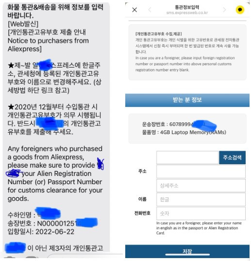 지난주에 이상한 메시지를 여러 건 받았다. 해외 직구 상품 수령을 위해 개인통관 고유부호를 입력하란 문자였다. 문자에 첨부된 링크는 안 누르는 게 좋다고 배웠기 때문에 그 메시지를 가볍게 무시했다. 하지만 반복해서 계속 도착했다. 게다가 내 이름 석 자가 딱 박혀서 오는 메시지라서 어딘가 석연치 않았다. 용감하게 링크를 클릭했다. 인적 사항을 기입하는 칸이 나왔고 고유 통관 부호를 적으라고 했으며, 하단에는 '내가 구매했다고 하는' 물건의 종류가 영문으로 기재돼 있었다. 5기가 랩톱 메모리? 곧장 취소를 눌렀다. 다른 문자의 링크를 눌러보니 웨딩 링이 있었고 또 다른 문자의 링크에는 정체를 알 수 없는 영문이 적혀 있었다. 그러니까 지금 내 이름과 번호로 보내지도 사지도 않은 물건이 오고 있다는 걸까??