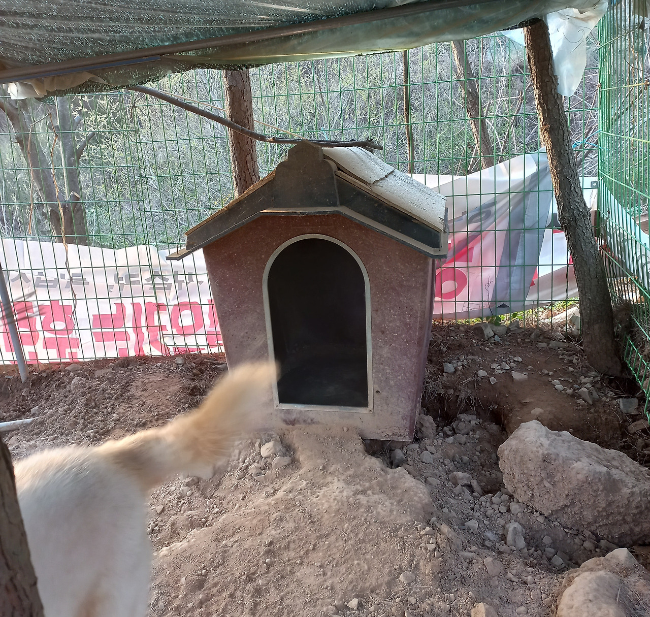 흰돌이의 곧 움직일 것 같은 집. 땅굴파기의 명수 흰돌이가 아빠가 만들어준 공간을 리모델링했다. 옥상 시절 반려동물로 갈등하던 우리집 상황처럼 위태롭게 느껴진다.