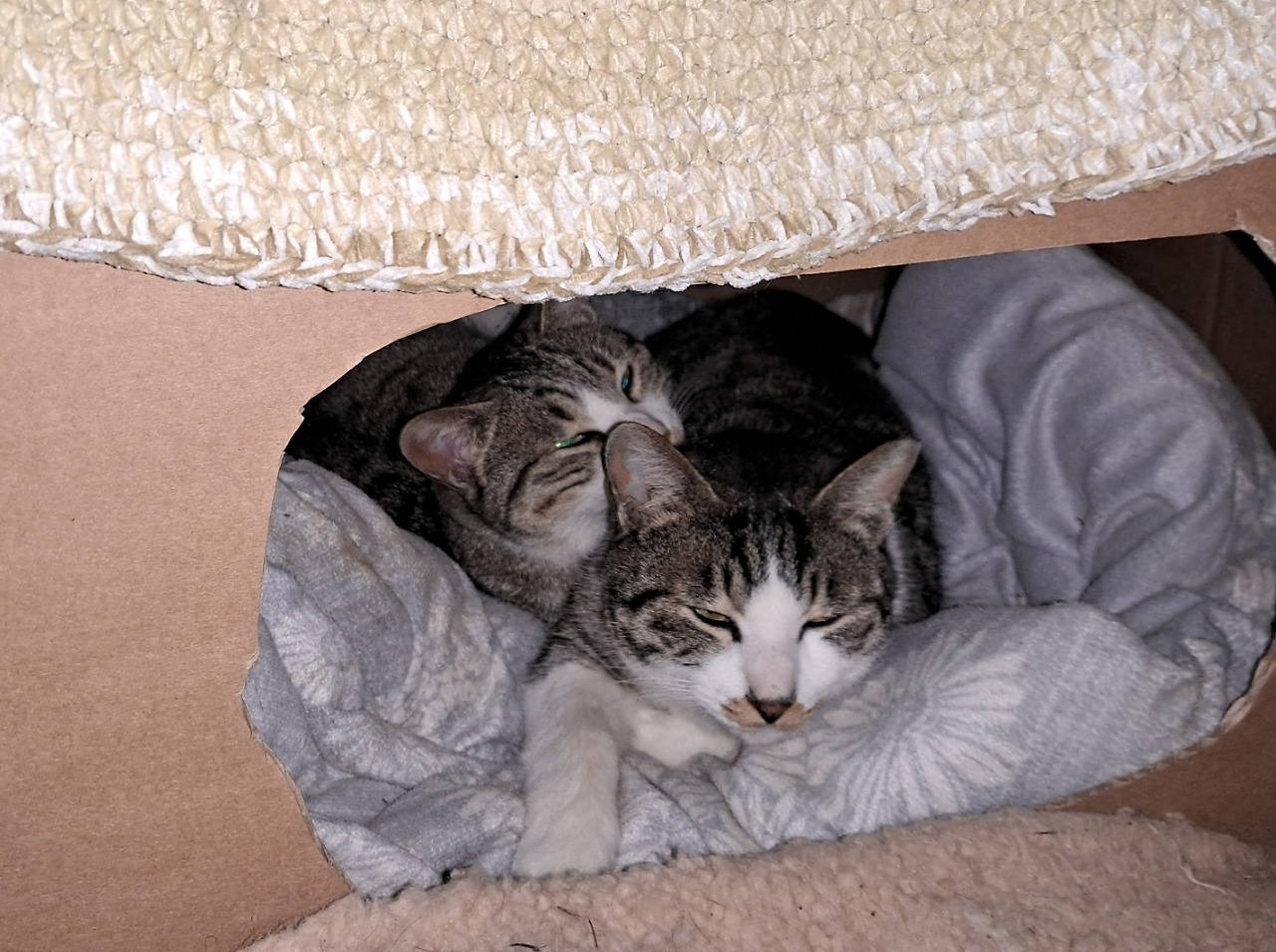 코스트코 출신 박스집. 우리 엄마의 뜨개 깔개와 내가 옛날에 쓰던 이불이 더해져 고양이집이 되었다. 애용 중인 세치와 네치.