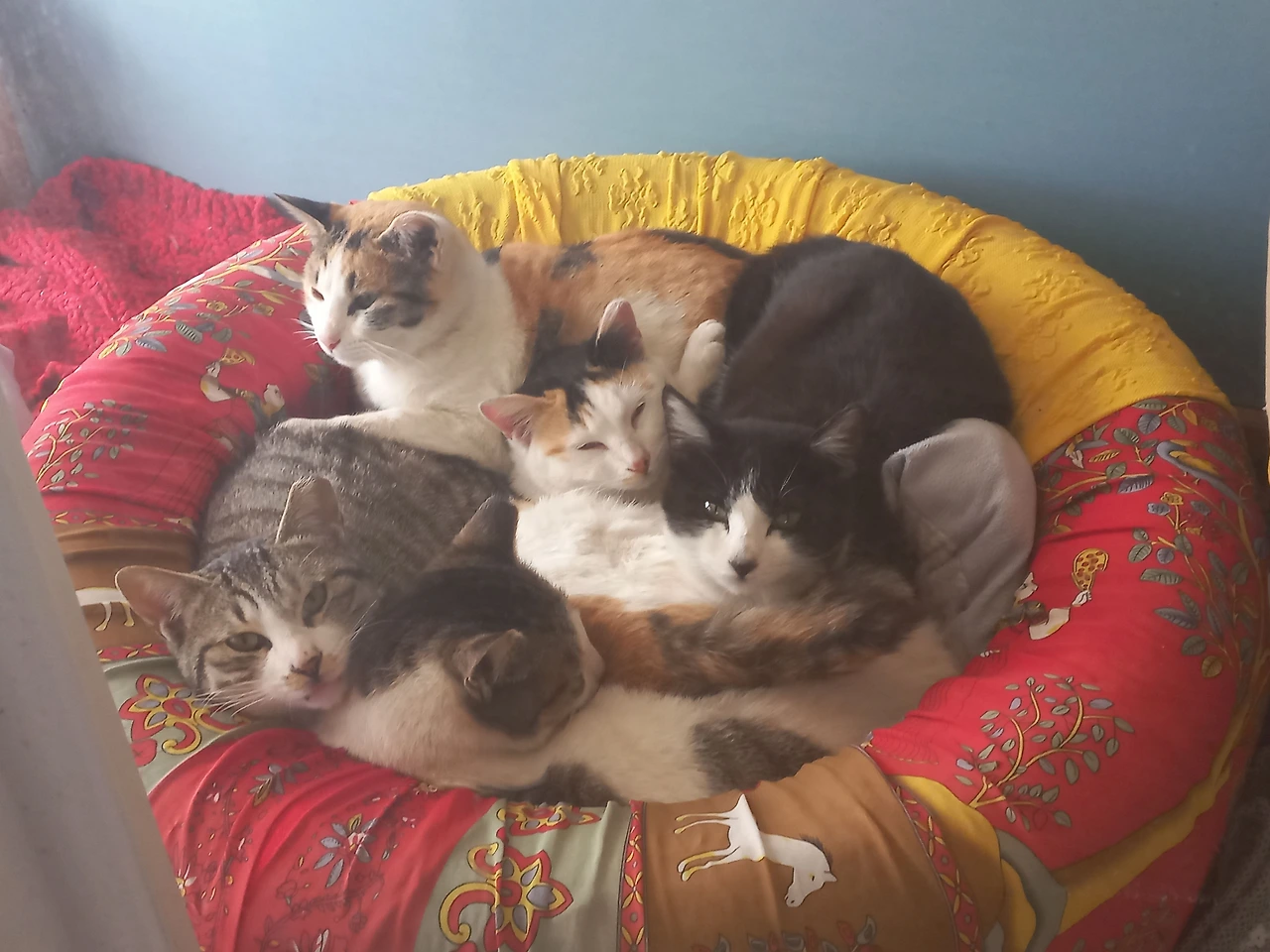 타이어와 자투리천을 이용한 고양이집. 두치, 세치, 네치, 뿌꾸, 콩알이가 한 바구니에 담겨있다.