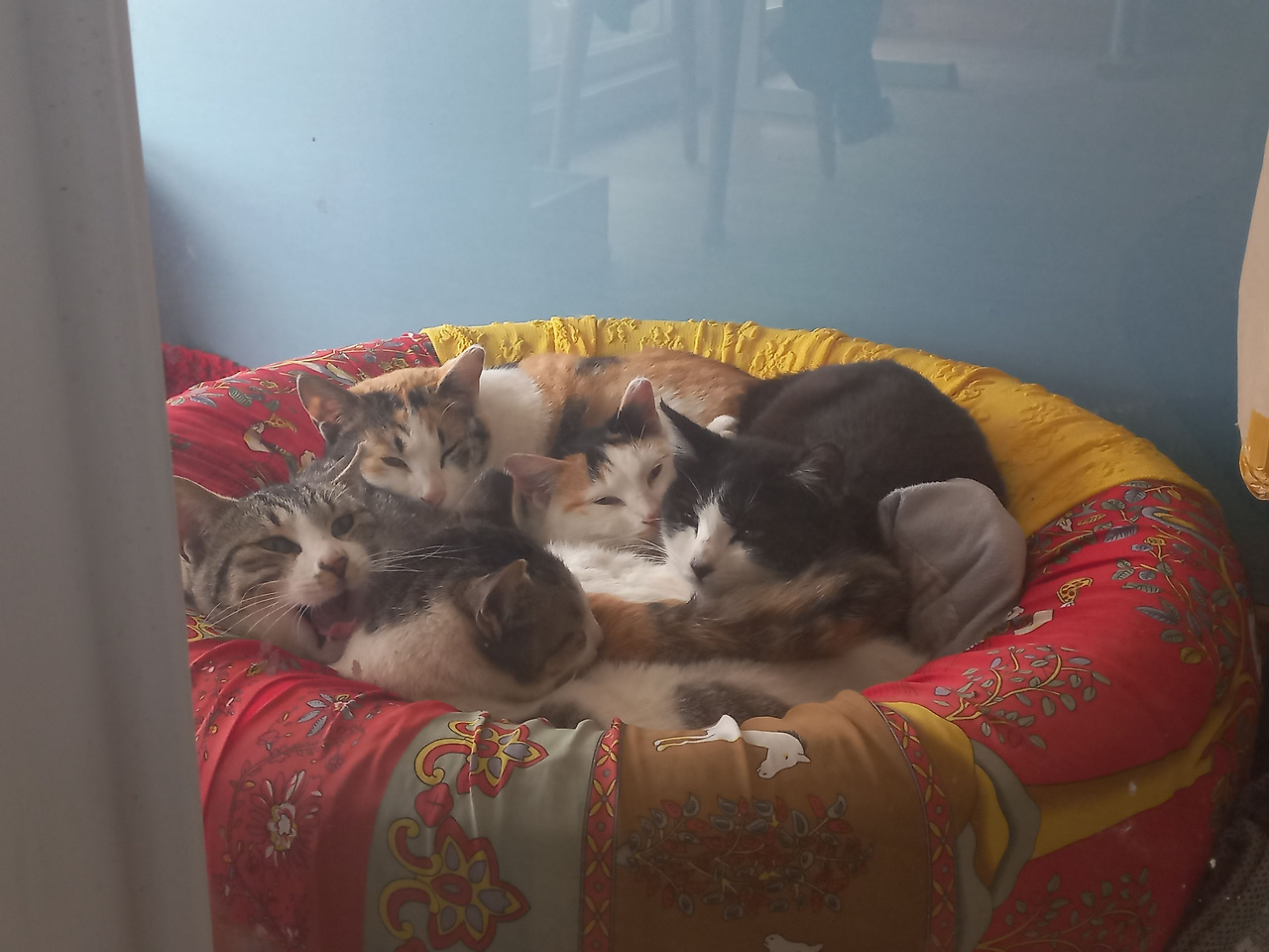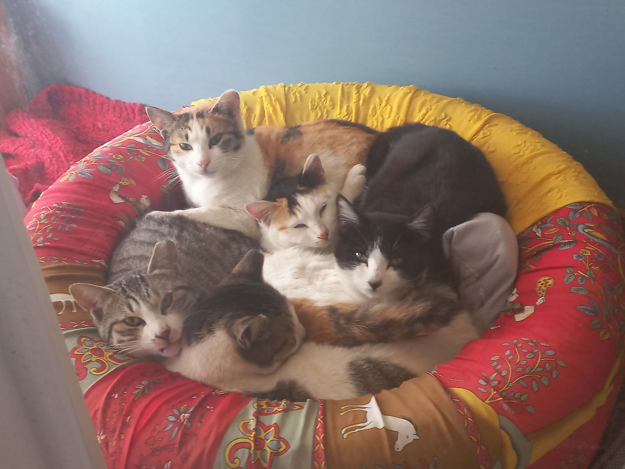 타이어와 자투리천으로 만든 집 안에 예쁜이 새끼들과 콩알이가 꼭꼭 붙어서 쉬고있다. 시계방향으로 두치, 뿌꾸, 콩알이, 한치, 세치. 네찌는 어디 가고 없다.