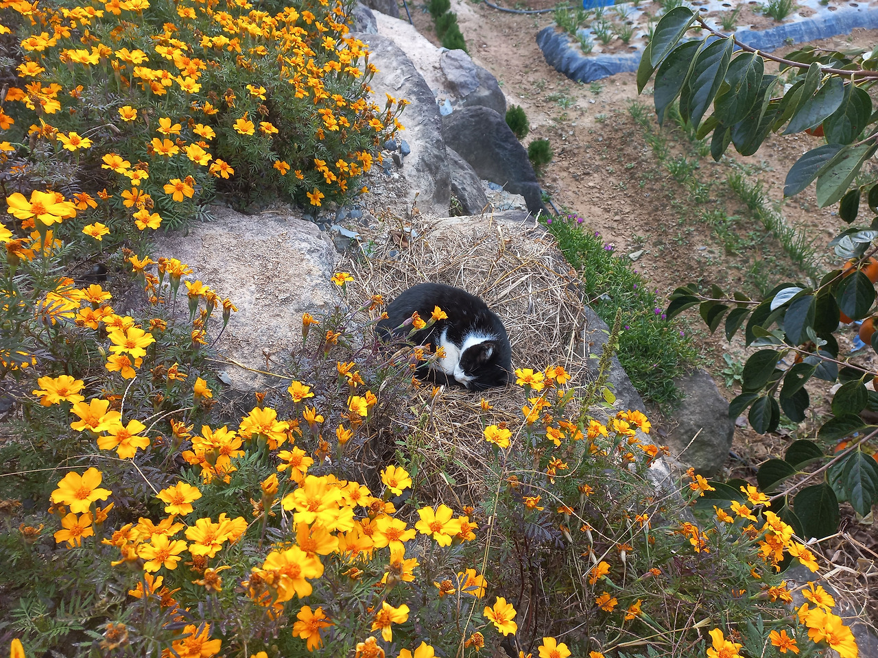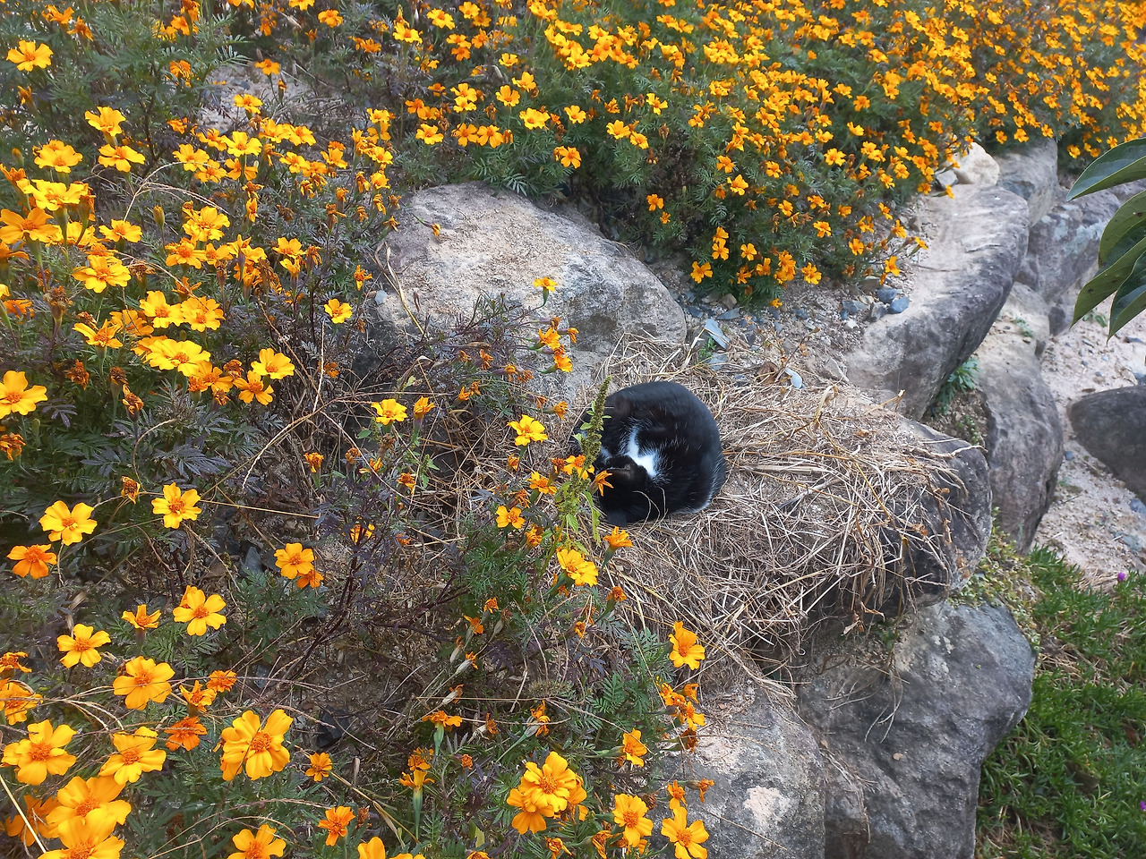 돌담 위, 사람은 딛기 힘든 작은 공간에서 콩알이가 쉬고 있었다. 당시 홀로 쉬고 있던 콩알이가 너무 예쁘면서도 쓸쓸해보였다. 메리골드와 너무 잘 어울리는 콩알이.