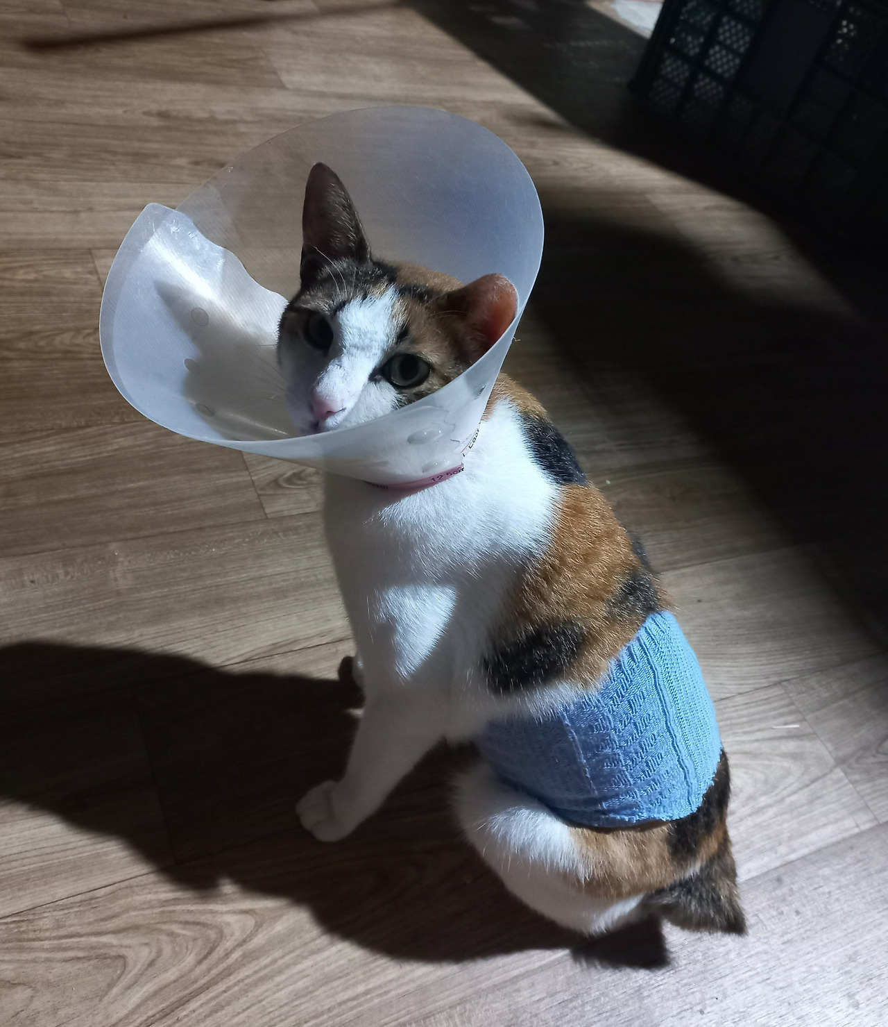 배를 크게 다쳤던 두치. 아침저녁으로 약 먹이고 소독했던 때였다. 환묘복 배송 전에 임시로 양말을 입혀두었다.
