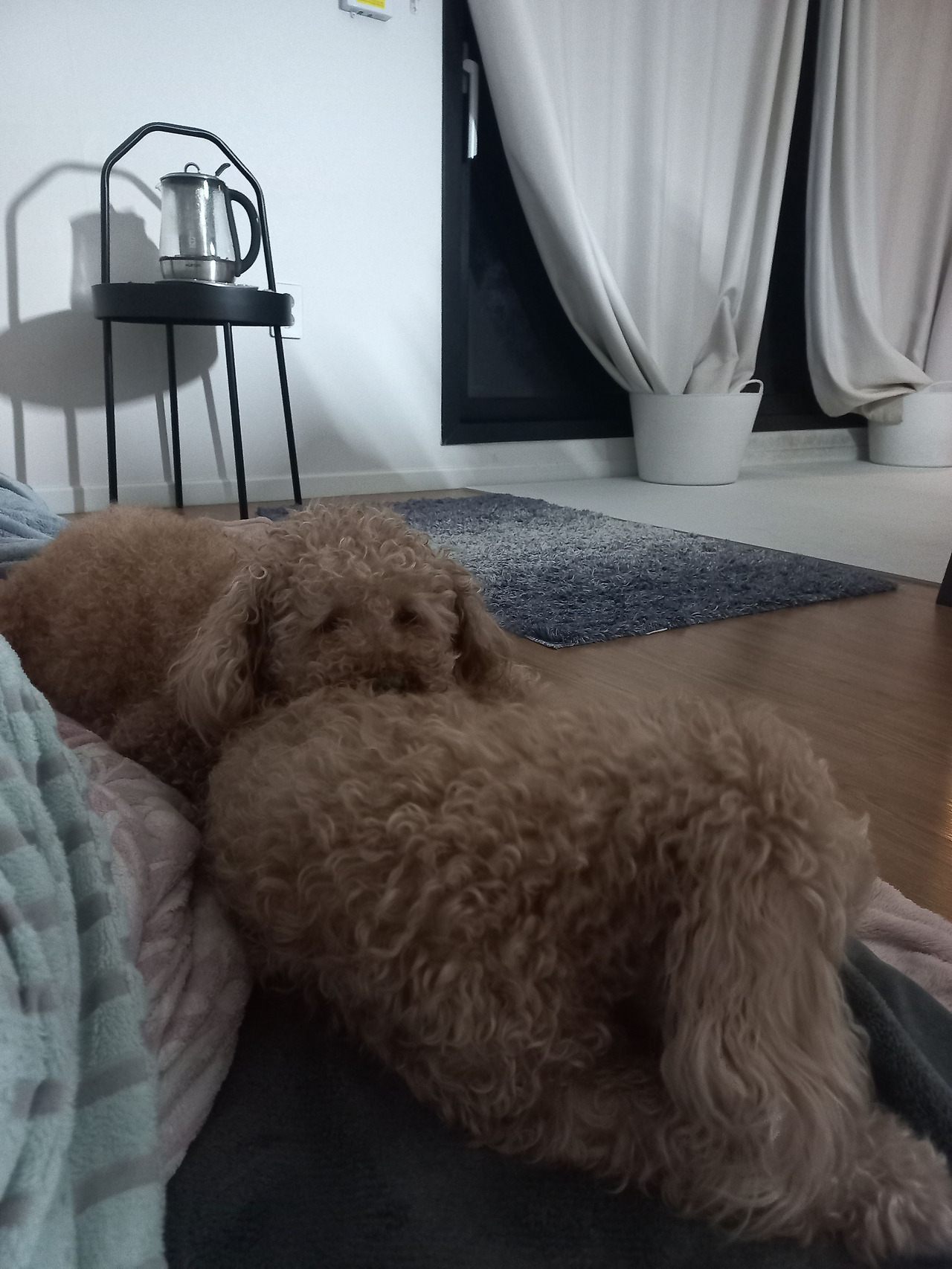 우리 집 푸들들은 가장 어린 두나와 세나가 열 살이 되어, 네 마리 모두 노년기에 접어들었다. 내가 보기에 우리 집에서 가장 빠르게 나이 들어가는 강아지는 푸들 1세대 할머니인 초코가 아닌 알파인 것 같다. 알파는 작년 하반기부터 아주 빠르게 나이 들어가고 있다. 초코와 비슷하게 심해진 백내장과 등을 뒤덮은 검버섯 정도는 애교다.