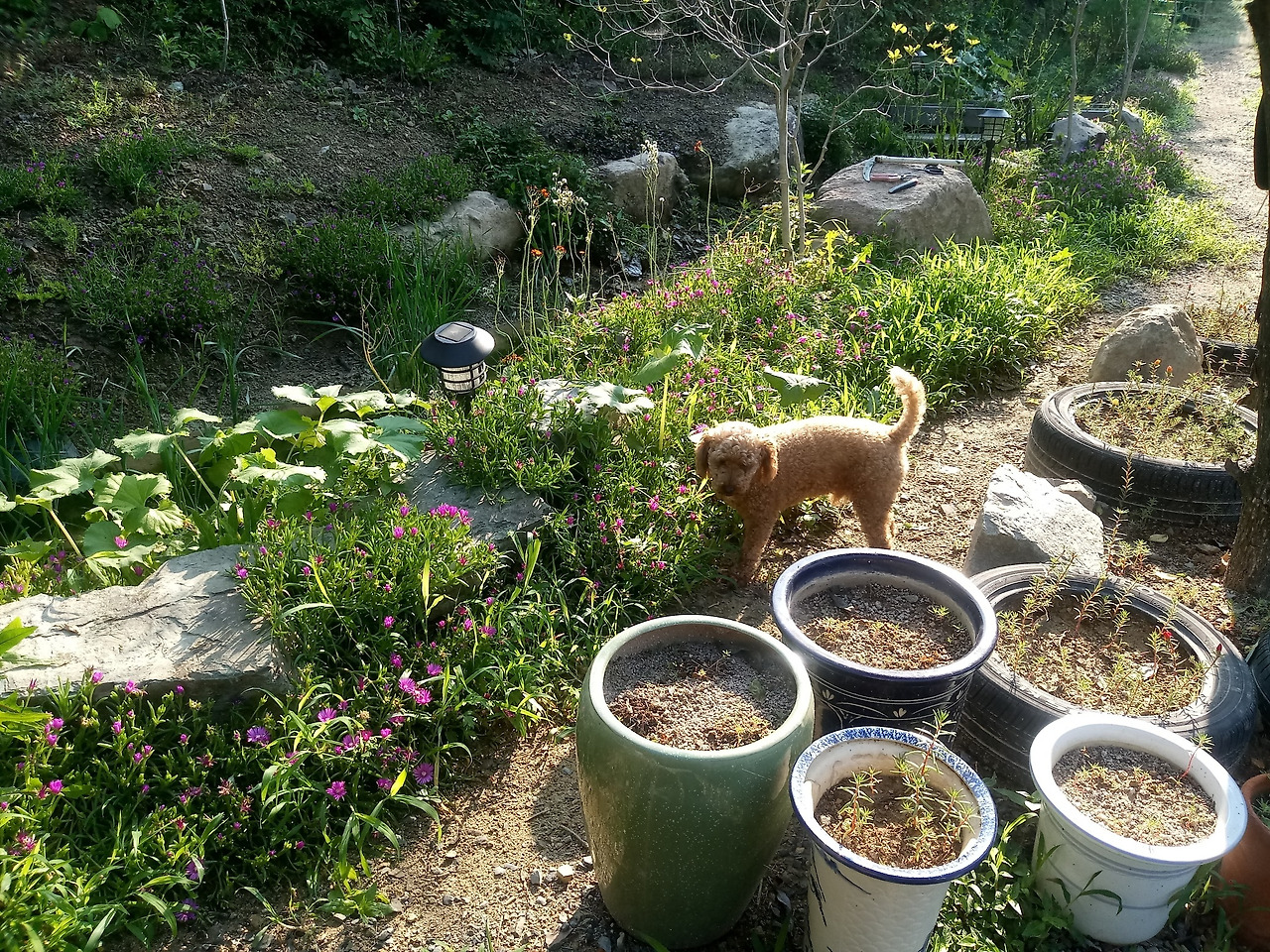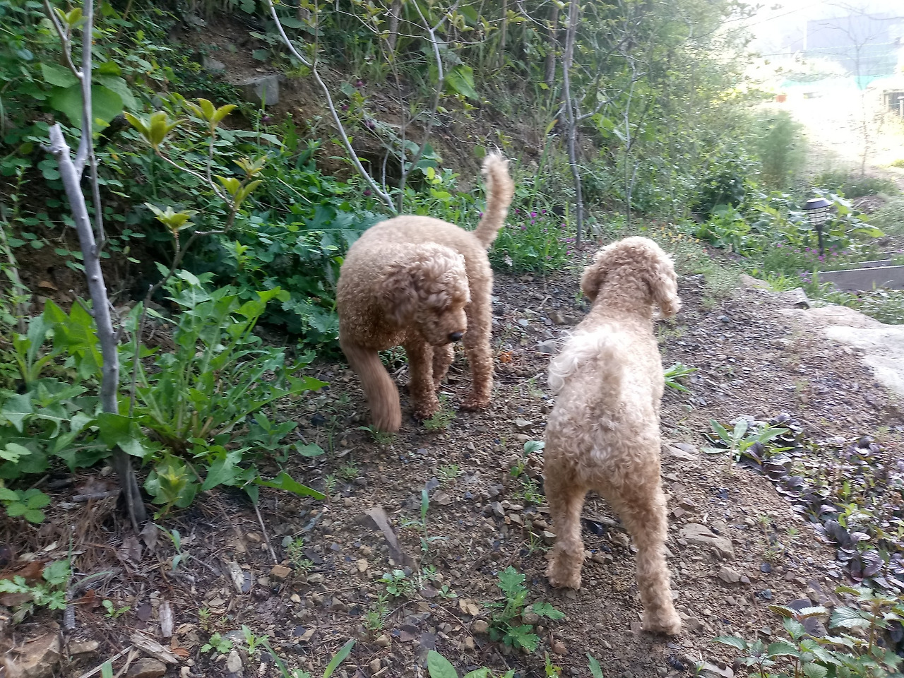 결국 우리는 그의 뱅글뱅글 증상을 시골까지 끌고 들어오게 되었다. 알파의 증상은 시골로 이사 온 뒤에야 고쳐나갈 수 있었다. 좁은 산길로 걸어서 갈지자로 걷거나 빙글빙글 돌지 않도록 방지했고, 직진으로 빠르게 따라올 수 있도록 내가 앞서 달려 나갔다. 알파가 나만 보고 쫓아올 수 있도록. 다른 강아지들의 주의를 빼앗는 낯선 개나 사람도 거의 없어서 우리는 알파에게 온전히 집중할 수 있었다.