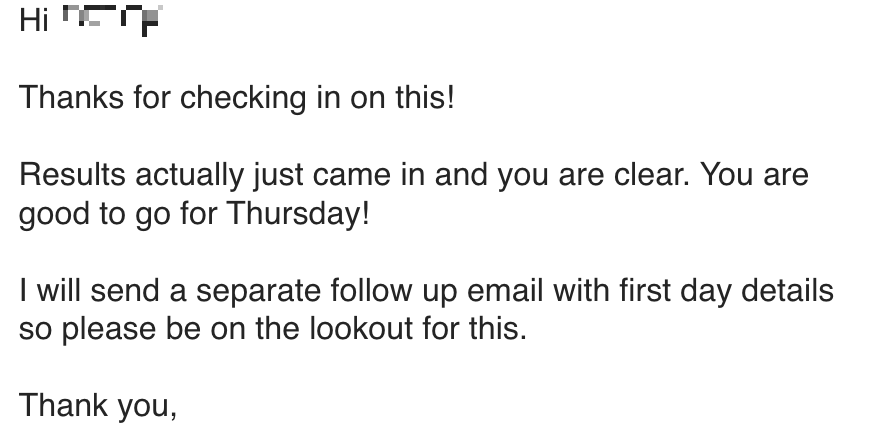 그렇게 몇일 후, 회사 HR에서 메일이 와서 약물 검사 결과가 안나왔으니 입사일을 미뤄야 할거 같다고 했다.