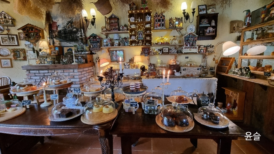 주택가 대로변에서 몇 계단을 내려서자, 푸른 정원과 유럽 시골 어딘가에 있을 법한 예쁜 건물이 모습을 드러냈다. 카페 내부는 크리스마스 소품 가게처럼 아기자기하게 꾸며져 있었고, 입구 근처 테이블 위엔 갖가지 빵이 진열되어 있었다.
