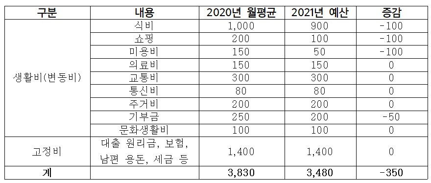 계속 가계부를 적어 와 우리 부부의 한 달 생활비를 알고 있었으나, 외벌이가 된 만큼 비용을 더 줄여야 했다.