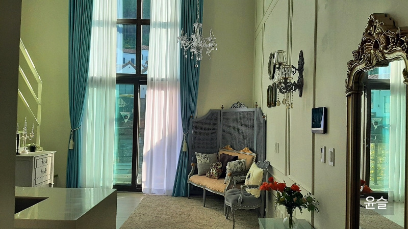 숙소가 깨끗한데다 예쁘고, 단지는 유럽식으로 꾸며져 산과 뾰족한 지붕이 어우러진 모습이 이국적이었다. 메타 프로방스와 가까워 위치 또한 좋았다. 부티크 호텔과 펜션이 절묘하게 합쳐진 느낌인데, 가격이 너무 합리적(평일 1박 7만 원 대)이라 30대부터 60대까지 5명 모두가 만족스러워했다.