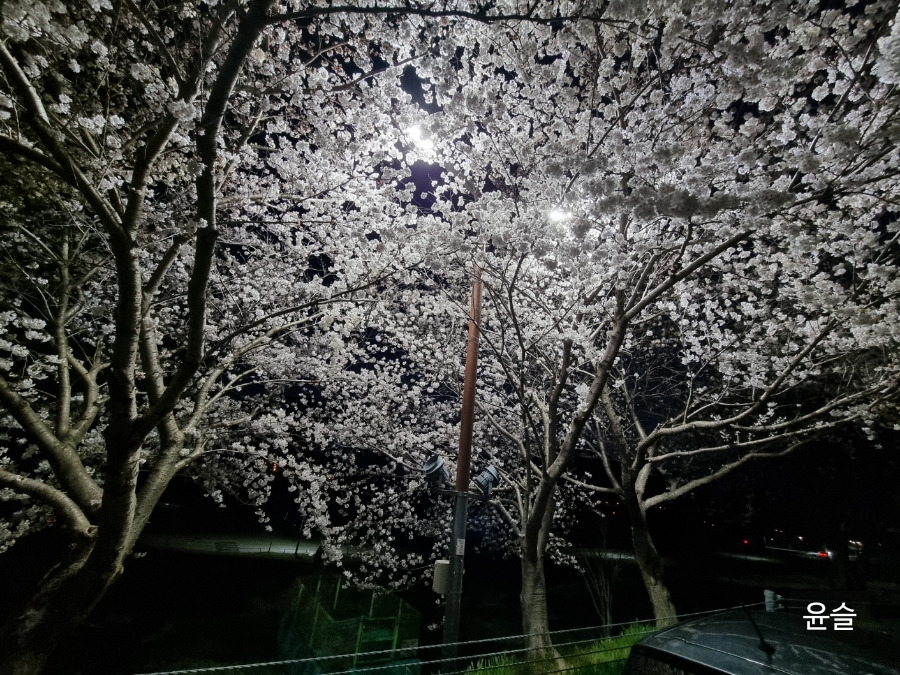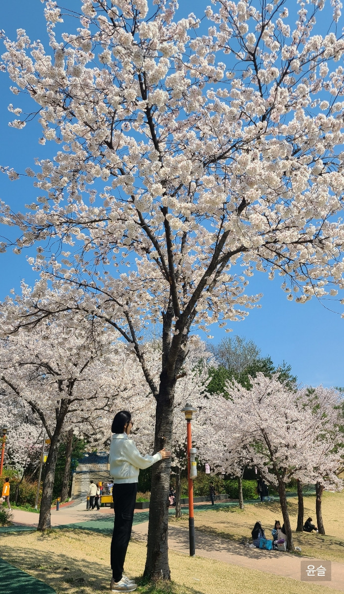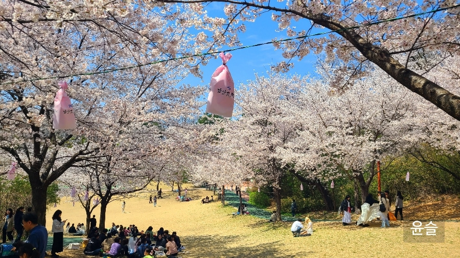 꽃으로 뒤덮여 하얗게 보이는 야산이 있었다. 올라가 보니 벚꽃 축제가 한창인 남산근린공원이었다.