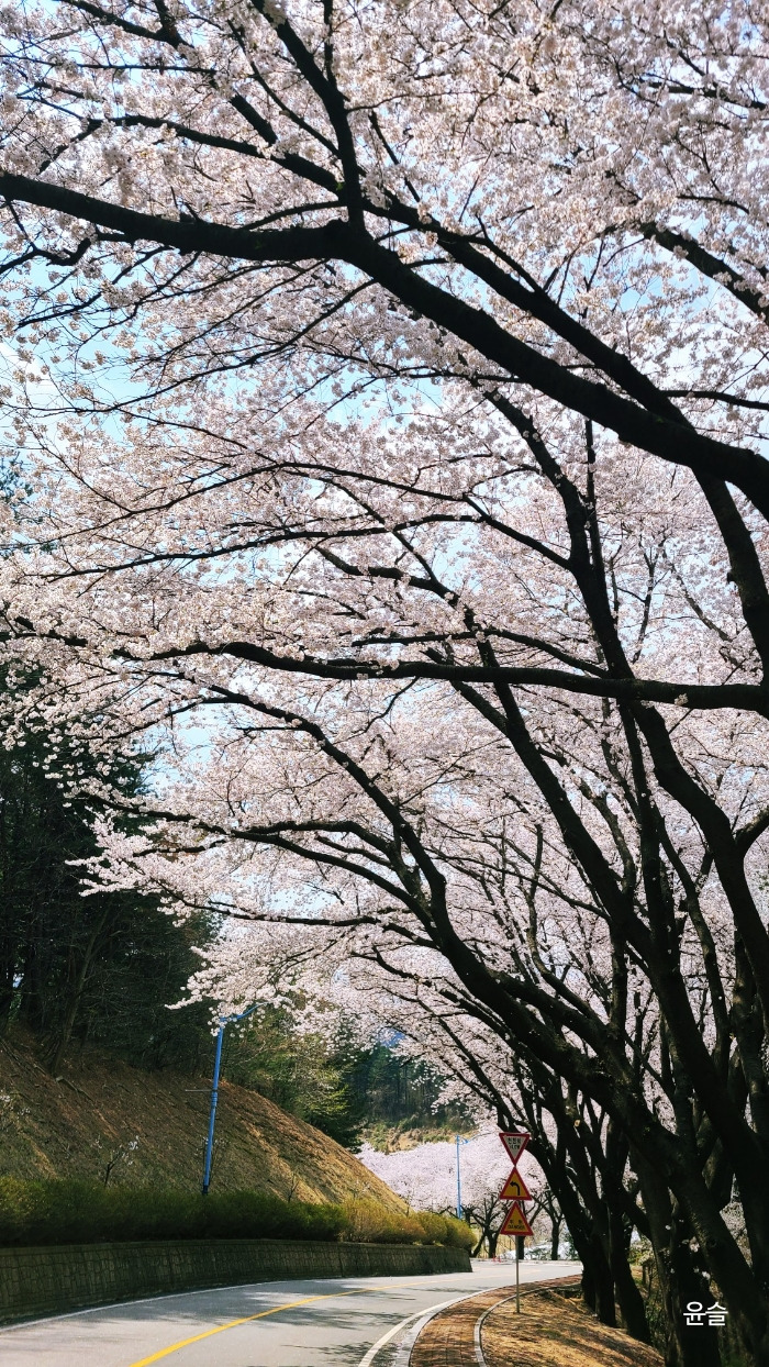 산을 따라 올라가며 한쪽엔 소나무가, 다른 한쪽은 엄청나게 큰 벚꽃 나무가 장관을 이루고 있다. 어마어마한 크기의 나무라 꽃의 양도 엄청나다.