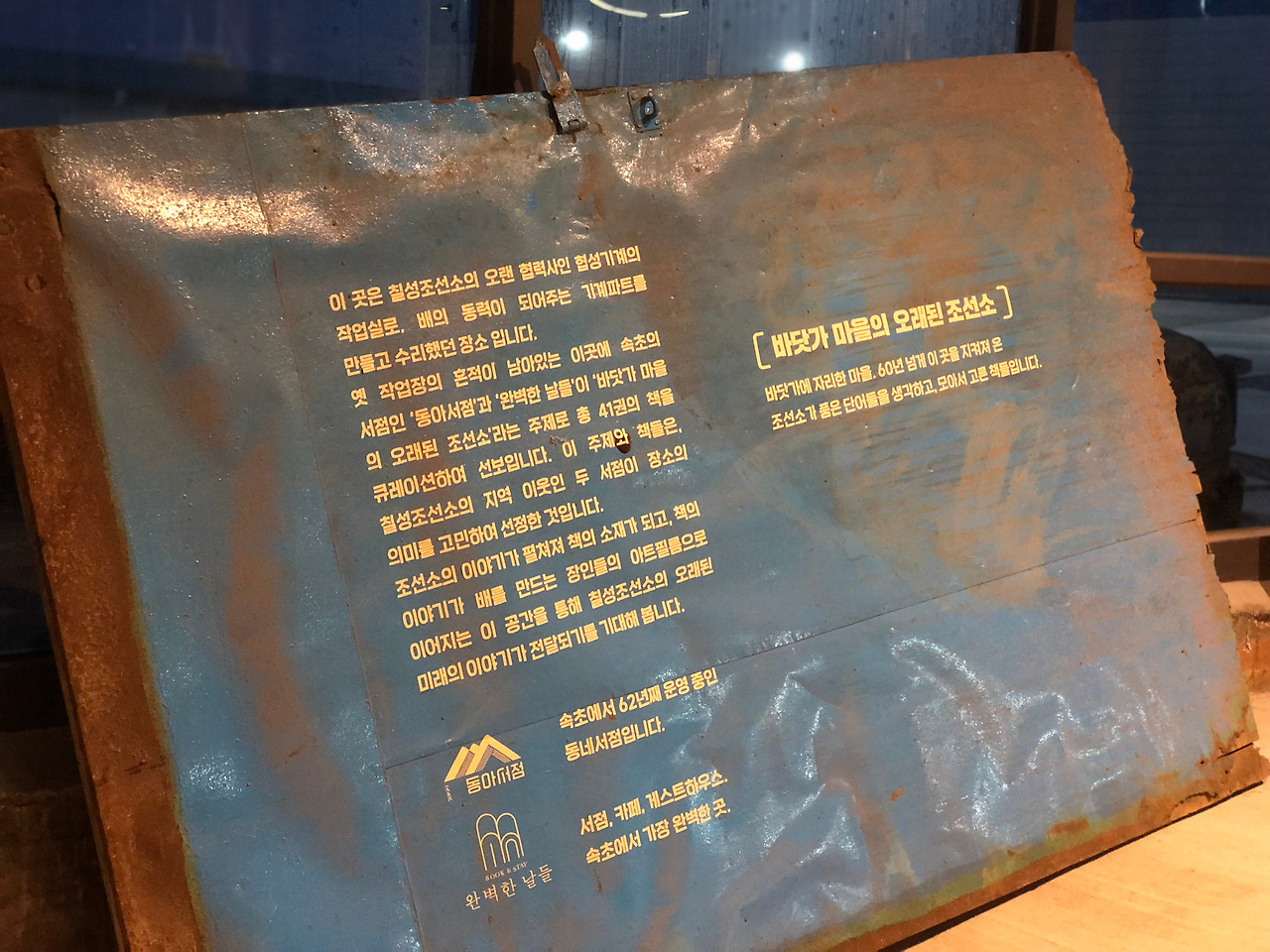 오래된 조선소에서 시작된 이야기. 이곳의 이야기로 책이 만들어지고, 아트필름이 생겨나고, 전시가 이뤄지며 종종 아티스트의 공연이 진행되기도 한다. 청초호 앞에서 '칠성조선소'를 바라보며 과거와 현재가 정말로 공존하는 기분이 들었다.
