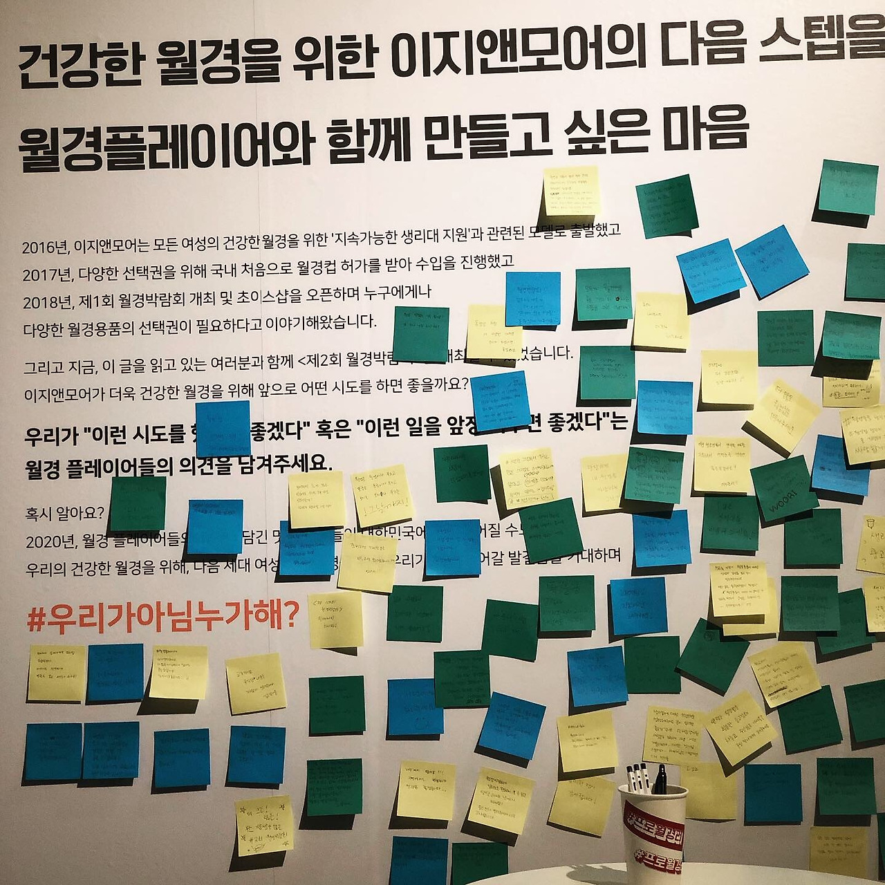 그 후 어른이 되어 생리대에 독성 물질이 검출된 사건인 일명 '생리대 파동'이 터졌다. 그때의 당혹감은 여전히 생생하다. 곧 월경 시기가 다가오고 있었는데 내가 가지고 있던 생리대를 다 버리고 싶었다. 이에 모든 사람이 각기 다르게 안전한 월경 용품을 찾으려 애썼다. 주변 지인들에게 좋은 제품을 추천해주기도 하고, 인기가 좋은 제품은 동이 나서 한참을 기다려야 했다. 나를 비롯한 여성들에게 다소 전쟁상황같이 다급했는데, 다른 한쪽은 너무나 평화로워 보이기도 했다. 그 시기 나는 여러 브랜드를 찾았고, 그중 한 브랜드가 바로 이지앤모어(EASE&MORE)였다. 여성이 자신의 불편함을 해소하기 위해 만든 곳으로 모든 여성들의 건강한 월경 라이프를 미션으로 직접 사용하고 선별한 국내외 월경 용품을 소개 및 판매하는 월경 셀렉트샵이다. 나는 이 브랜드를 알아보며 신뢰하게 되었고 여기저기서 안전한 월경 용품을 찾아보고 사용하는 대신 '이지앤모어'에서 선별해준 제품을 확인하고 구매했다. 지금까지도 이지앤모어를 신뢰하며 애용하고 있다.