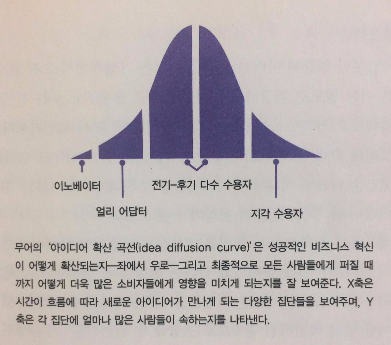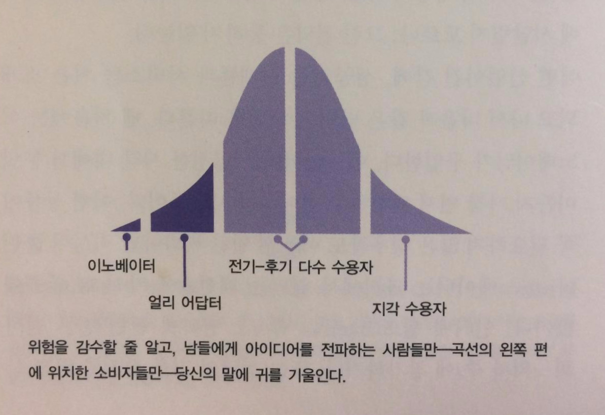대부분의 매출은 새로운 것을 시도하기 좋아하는 소비자 집단에게 어떤 제품이 받아들여진 다음에야 생긴다는 것을 알 수 있다. 얼리 어답터는 전기 및 후기 다수 수용자 집단이 안심하고 신제품을 살 수 있는 분위기를 조성한다. 결정적인 매출은 곡선의 왼쪽 편에 있는 소비자 집단이 완전히 구매한 다음에야 이뤄진다. 그런데 여기서 주목해야 할 점은, 곡선의 각 단계에 있는 대다수의 소비자들이 당신을 무시한다는 사실이다 그것도 매번 전기 및 후기 다수 수용자들은 제품을 써본 주변 사람들의 말은 귀담아듣지만 당신의 말은 무시할 것이다. 곡선의 왼쪽 편을 건너뛰고, 영양가 있는 중간 부분으로 바로 가고 싶은 유혹에 시달릴지 모르나, 그런 전략은 통하지 않는다.