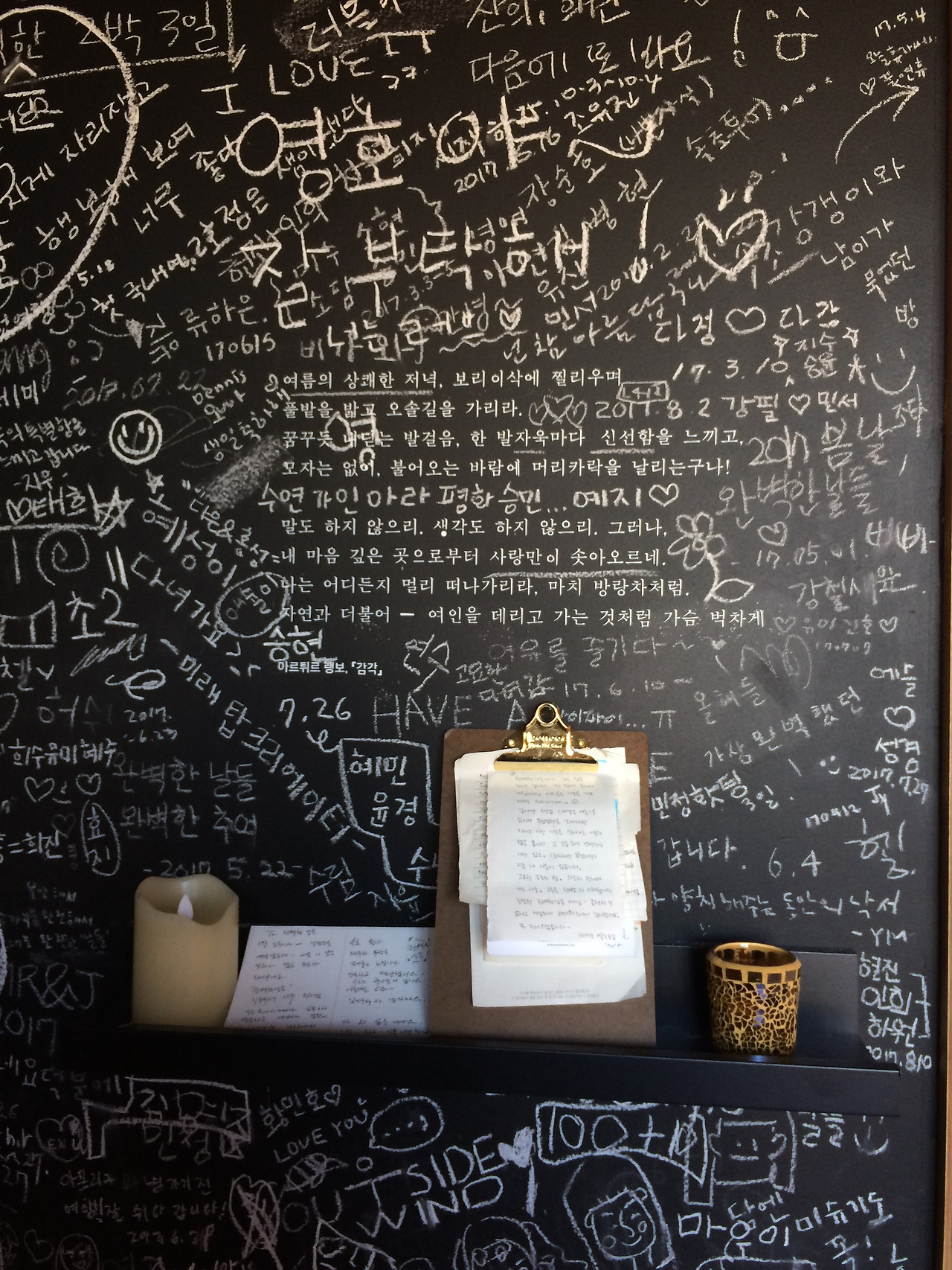 서점도 그렇지만, '완벽한 날들'의 게스트 하우스에는 여러 글귀들이 벽, 방문, 창문 등에 새겨져 있다. 하나하나 정성스럽게 붙인 듯한 그 글귀들은 그 순간, 그 공간을 더욱 의미 있게 만들어 준다. 공용 공간 가운데 테이블 서랍에는 이전 여행자들, 사장님의 손때 묻은 책들이 있었다. 한쪽 벽면은 방문자의 메모, 손편지들로 가득 차 있었는데 그 글 하나하나가 짧은 소설이라는 생각이 들었다.