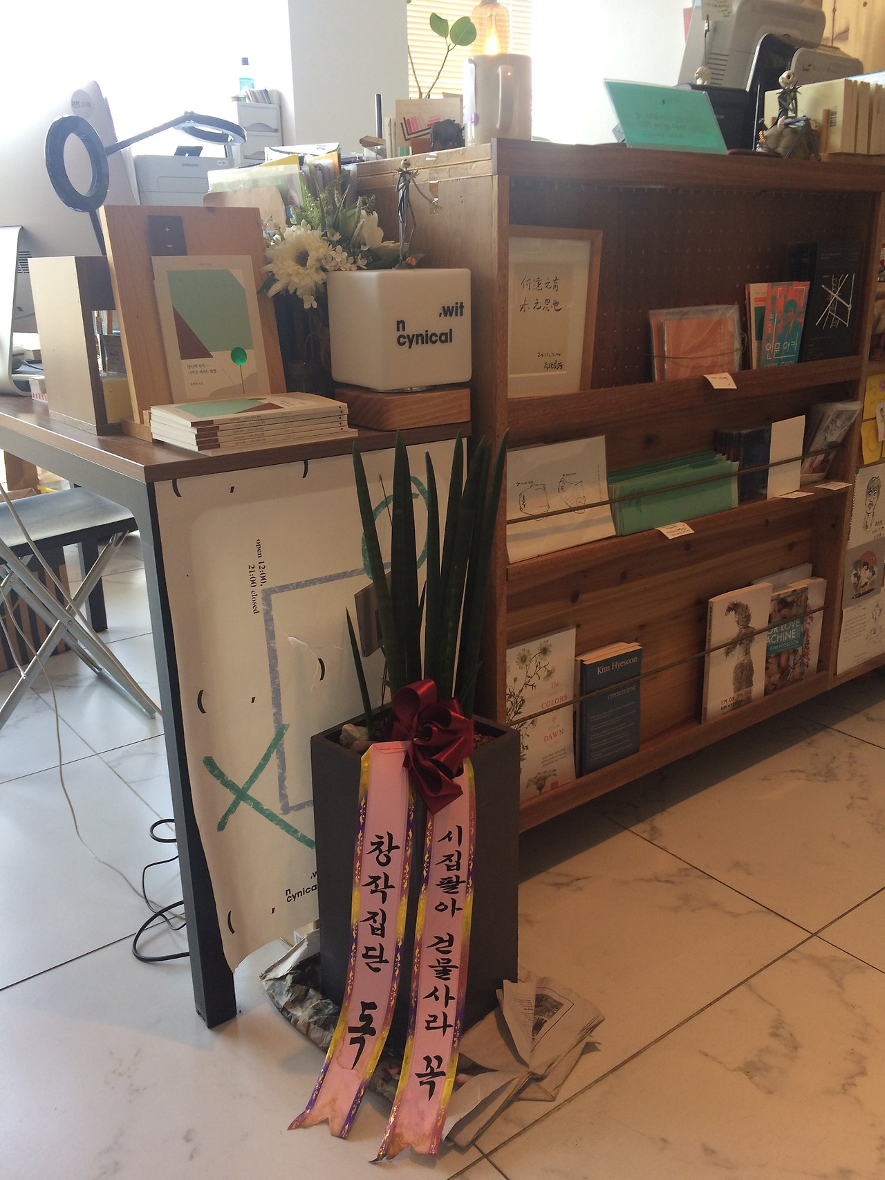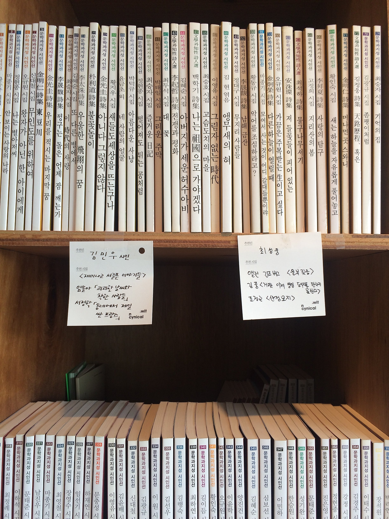 위트앤시니컬은 유희경 시인이 운영하는 시집 책방이다. 이곳엔 시집과 시인이 쓴 책 혹은 문학계와 관련된 콘텐츠들이 있다. 신촌역 근처에 1호점을 내고 합정에 2호점을 냈다고 하니 수익이 아주 없는 건 아니란 생각에 다행이다 싶었다.