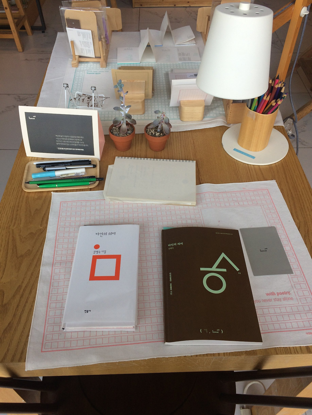 또한 위트앤시니컬에는 '필사의 공간'이 있다. 이는 혼자 명명한 이름인데, 한 권의 시집, 노트가 놓인 책상과 의자가 있는 공간이다. 이곳에 앉아서 시집 순서에 맞게 빈 노트에 시를 필사하는 것이다. 한 사람당 보통 한 편의 시를 필사하며, 시를 적었으면 끝까지 다 적고 본인의 이름도 기록해달라는 안내가 있다. 인터뷰를 찾아보니 시를 적은 이 노트는 시집을 만든 시인에게 전달된다고 한다. 내가 적은 시가 시인에게 전달된다니 펜을 잡은 손에 힘이 들어갔다.