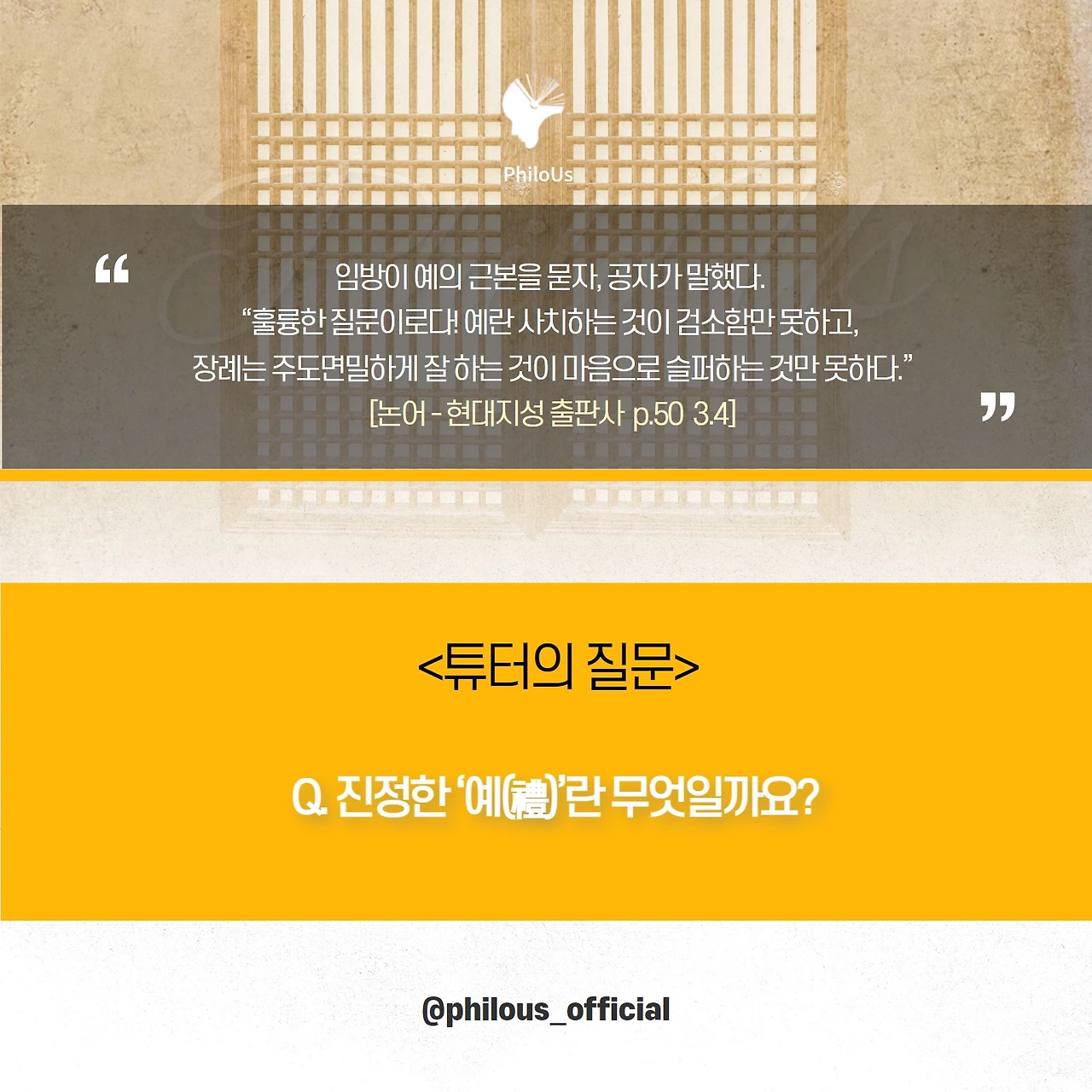 임방이 예의 근본을 묻자, 공자가 말했다. "훌륭한 질문이로다! 예란 사치하는 것이 검소함만 못하고, 장례는 주도면밀하게 잘하는 것이 마음으로 슬퍼하는 것만 못하다."(3.4)