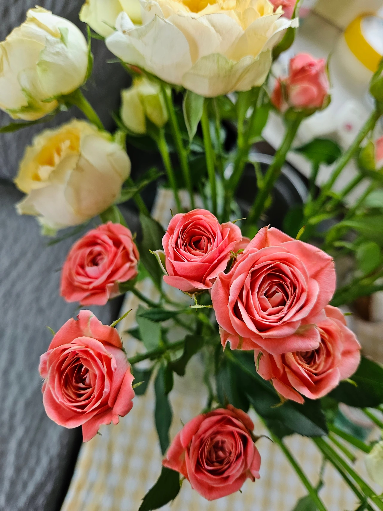 아무런 근거도 없는 말이지만 장미의 가시는 일종의 생명력과도 관계가 있지 않나 하는 생각이다. 그간 꽃집에서 사 왔던 매끈한 장미들과는 달리, 이 녀석들은 물도 잘 먹고(꽃병의 물이 줄어드는 속도가 느껴질 정도로) 기세도 등등해서 며칠이 지났는데도 고개 숙이는 녀석 하나 없이 전원 쌩쌩하다. 그런 거라면, 꽃대를 다듬을 때 손이 더러 찔리는 것을 감수하더라도 가시 있는 장미가 좀 더 많아졌으면 싶기도 하다. 아름다운 것의 생명이 너무 짧다는 건 언제나 너무 슬픈 일이기 때문에 말이다.