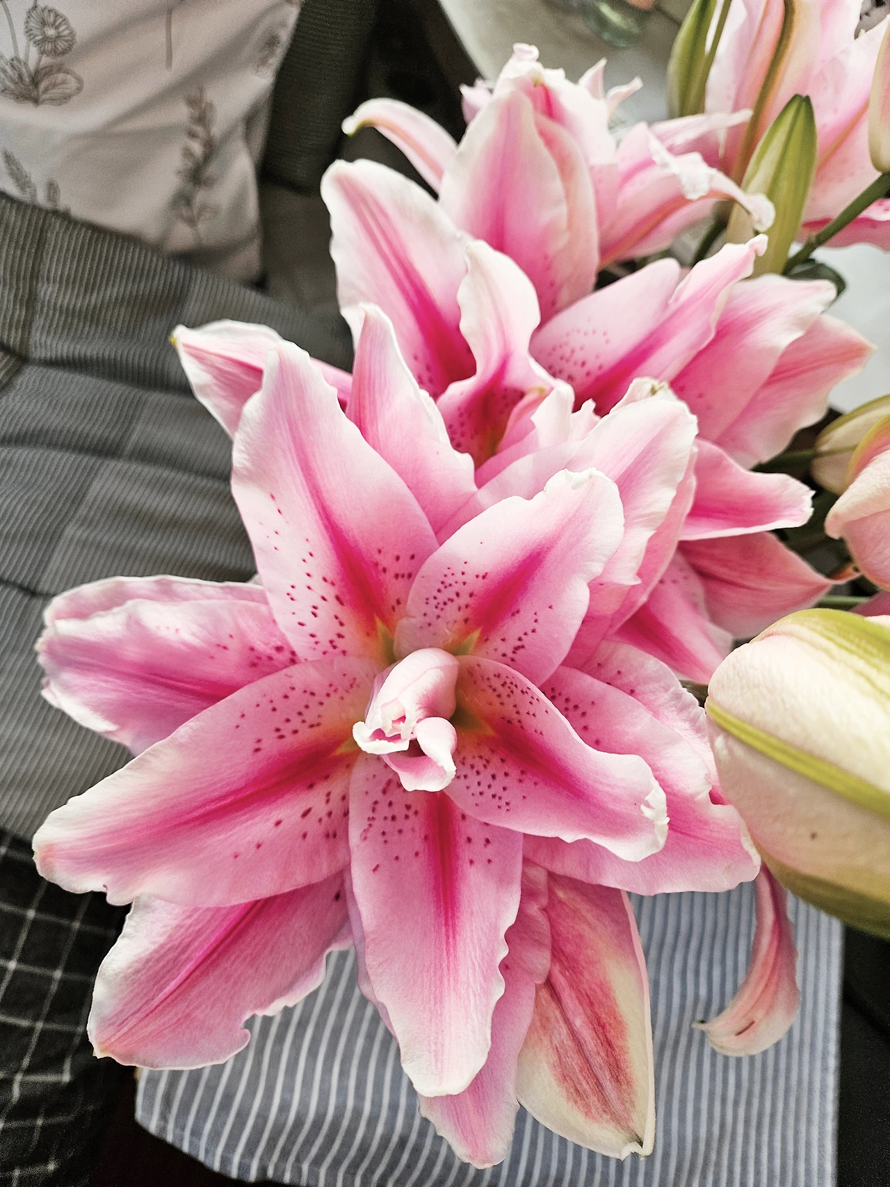 그리고 며칠 사이, 겹백합은 하루가 다르게 봉오리를 살 찌우기 시작하더니 주말쯤부터 무섭게 피기 시작했다. 연한 핑크색의 꽃잎이 몇 겹으로 피어나는 그 자태가 워낙 화사하고 예뻐서 나는 몇 번이나 오며 가며 꽃병 앞에 발을 멈추고 그 꽃을 넋을 놓고 구경하다가 내 자리로 돌아오곤 한다. 벌써 일곱 송이가 만개했고 그만큼이나 설레는 것은 아직도 피지 않은 봉오리가 또 그만큼 남아 있다는 사실이다. 이 봉오리들이 다 피어나면 얼마나 예쁠까. 요즘 그런 걸 생각하느라 나는 괜히 딱히 볼 일이 없음에도 불구하고 그의 책상 근처에 가서 한참을 얼씬거리다 돌아오곤 한다.