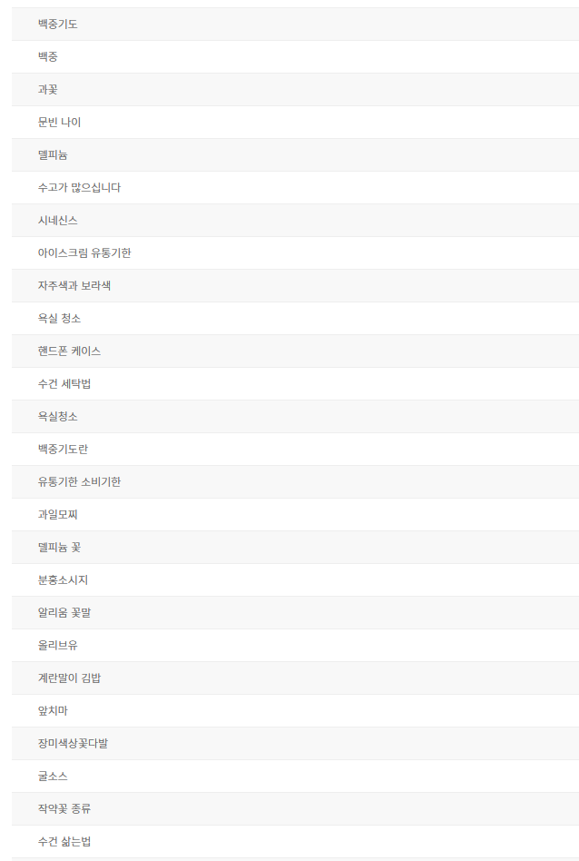 별로 그런 것 같지는 않다. 어제 오랜만에 통계 페이지를 구경하러 갔다가 나는 좀 식겁을 했다. 어떤 유입 키워드가 있는지를 보러 갔더니 어제 하루 내 브런치에 걸린 유입 키워드가 무려 427건이나 되었다. 아니 이 뻔하디 뻔한 브런치에 무슨 검색 걸릴 키워드가 400건이 넘어? 싶어서 그 유입 키워드들을 하나하나 살펴봤다. 그러나 안타깝게도 엉뚱한 키워드는 거의 없었고 다 내가 언젠가 글에 쓴 적이 있는 키워드들 뿐이어서 나는 좀 많이 머쓱해졌다. 백중기도, 욕실 청소, 수건 삶는 법, 핸드폰 케이스, 스토크 물올림 등등.